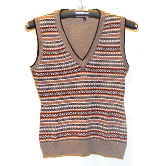 This is a sleeveless pullover which is suitable for both men and women. The knitted garment has a V-shaped neckline, featuring a white, brown and orange stripped pattern.