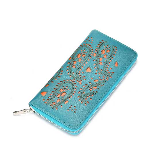 This is a polyurethane punched purse that is adorned with paisley patterns in two contrasting colors. The zip-up interior section is especially designed for storing coins and cards. Finely crafted with exquisite craftsmanship, this unique purse is an ideal addition to complete your wardrobe.