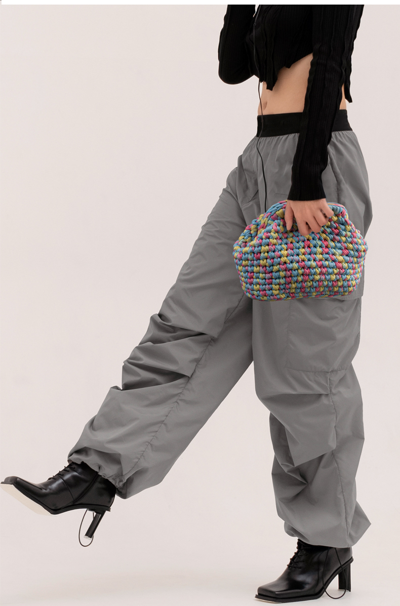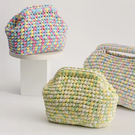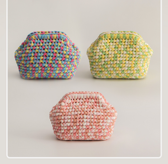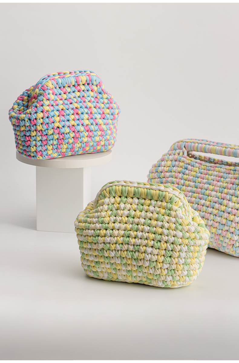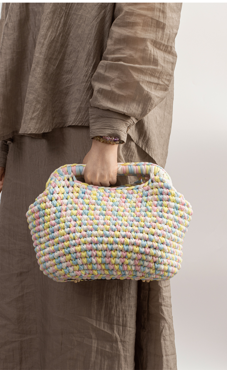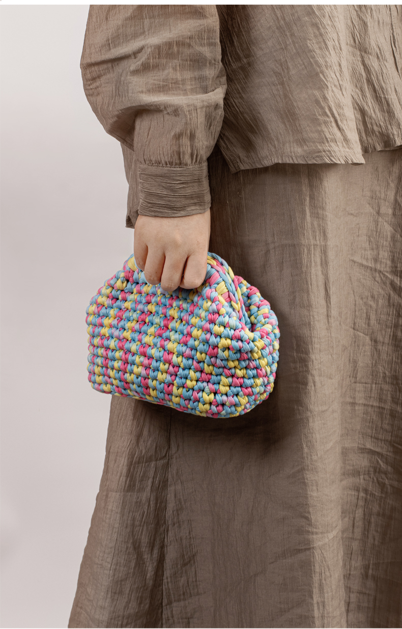 A pure hand-knitted crochet clutch bag made of cotton, featuring a woven line design and slip-on closure, perfect for fashion-conscious women seeking a unique daily or shopping accessory.
