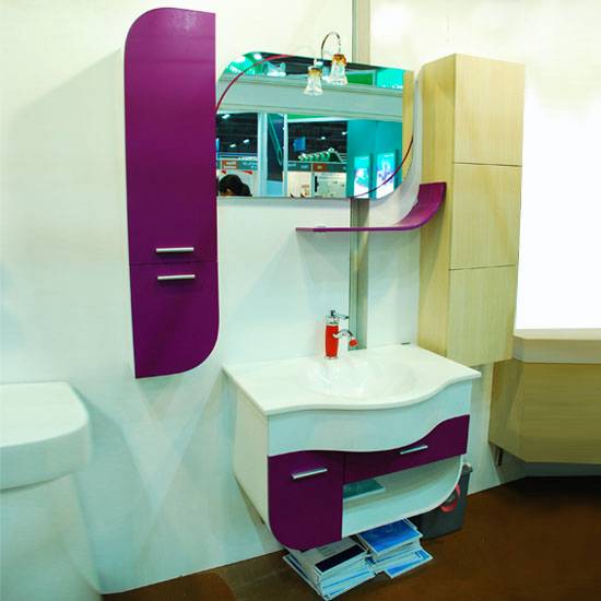 This basin with a cabinet is in contrasting purple and white colors. It features curvy contours of the shelves, mirror and cabinet for a romantic and modern style. The different parts of the cabinet can be installed separately for different needs in the bathroom setting.