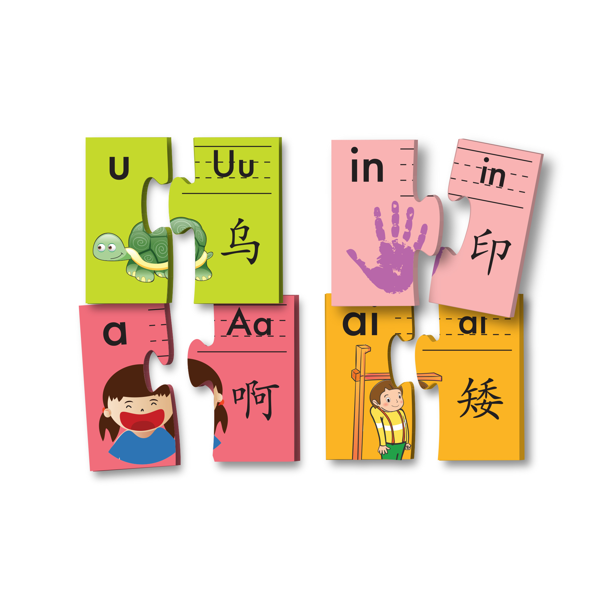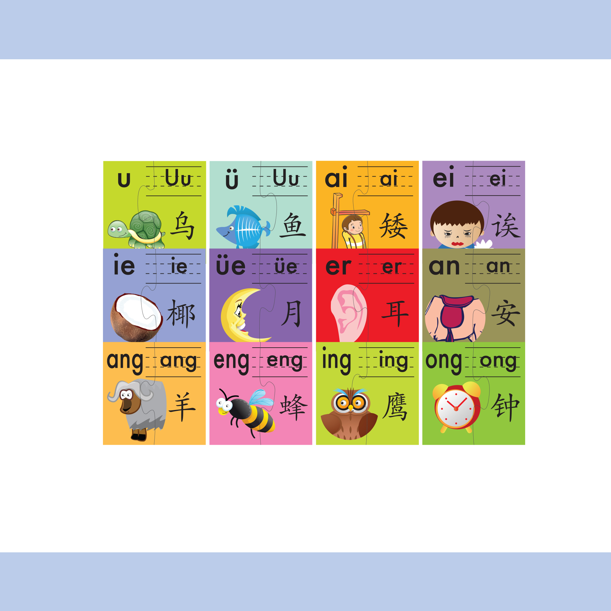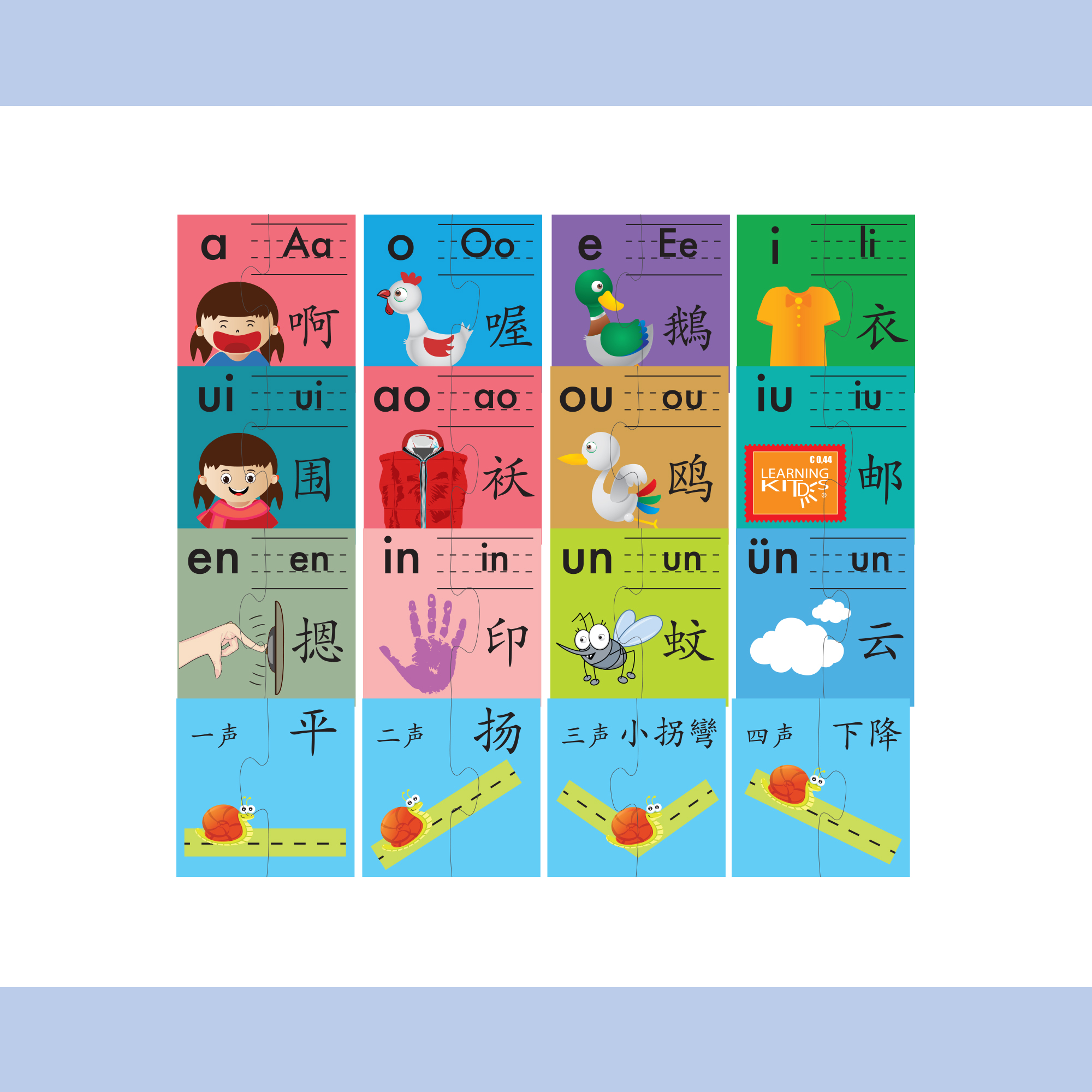 With the help of interesting pronunciation puzzle cards, children can learn and practise the initial consonants and final vowel sounds quickly and correctly. By choosing the finals, children can see the corresponding Chinese syllables with their Chinese characters and examples.