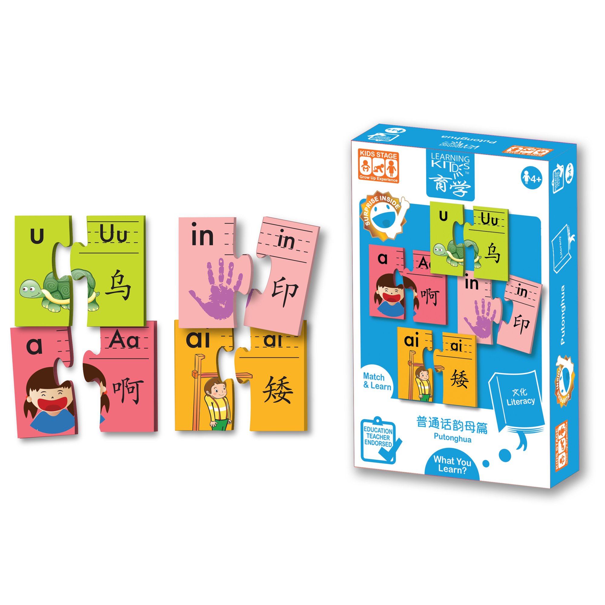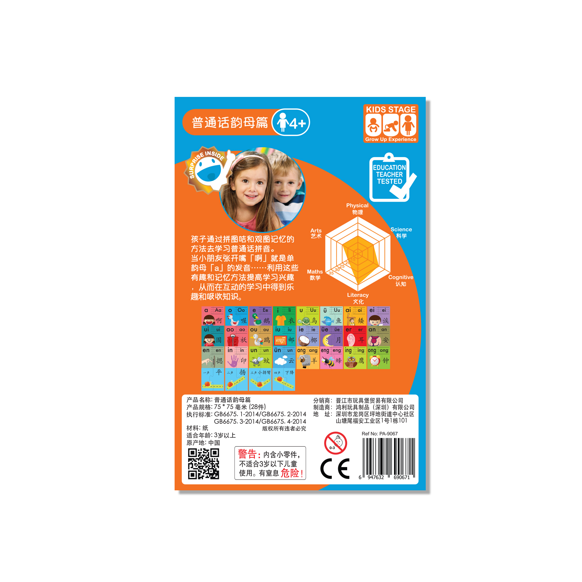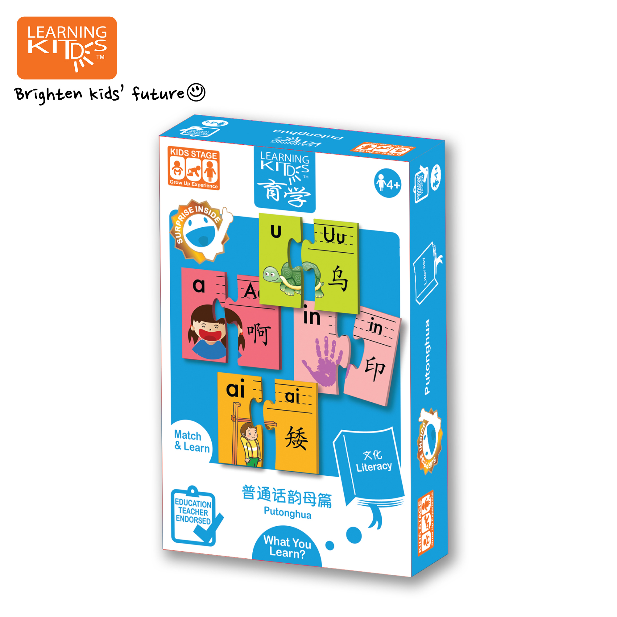 With the help of interesting pronunciation puzzle cards, children can learn and practise the initial consonants and final vowel sounds quickly and correctly. By choosing the finals, children can see the corresponding Chinese syllables with their Chinese characters and examples.