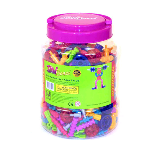 Shown here is a jar of puzzle blocks designed for children. Players can build different kinds of objects of their imagination with these colorful pieces. A unique design allows for unrestricted building and connection between pieces, making this simple game fun and enjoyable.