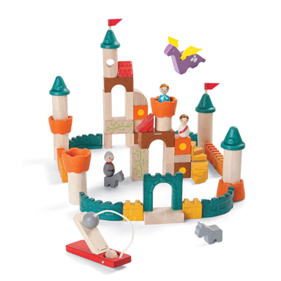This is a set of fantasy puzzle blocks in assorted colors. It consists of 60 pieces in different shapes. Let your imagination run wildly and build a medieval fantasy world completely with a functional catapult, a king and a queen, a knight, 2 horses and even a flying dragon!
