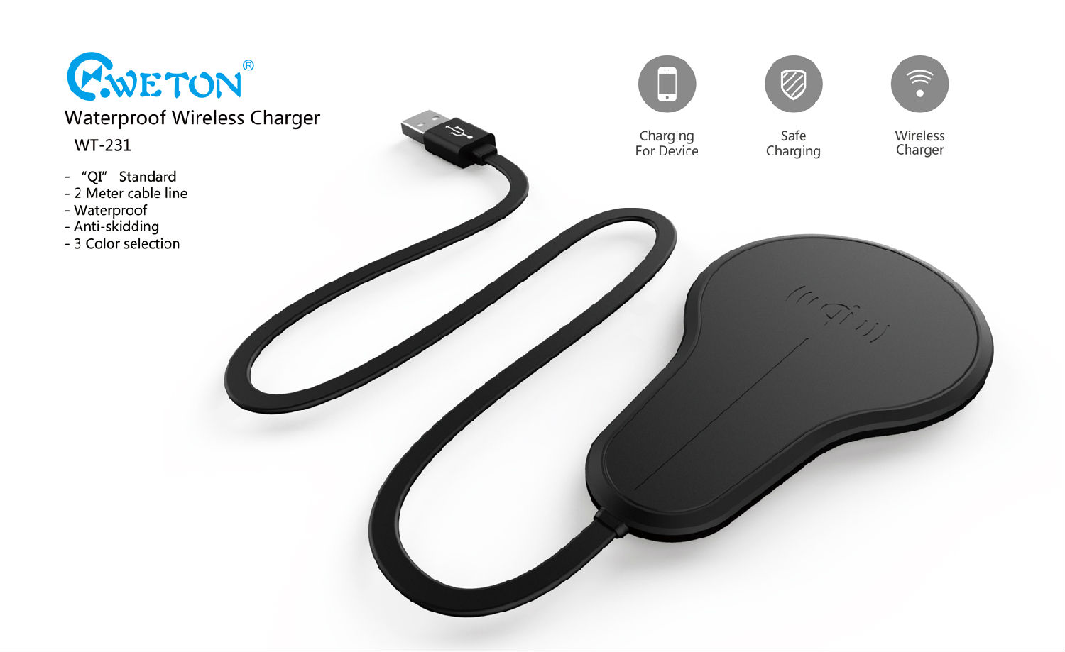 This QI wireless charger is designed to offer safe and convenient charging. It has a pear shaped body with anti-skid surface and has a 2-meter cable. The charge is waterproof and is suitable for charging all QI compatible devices.