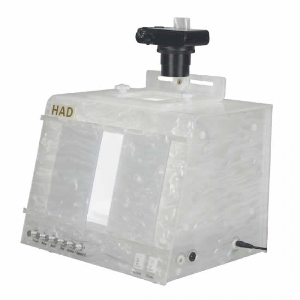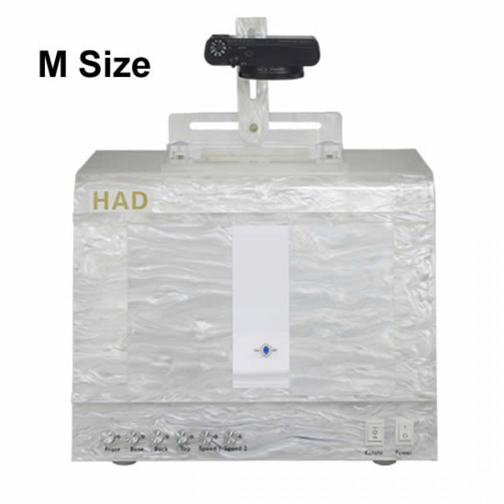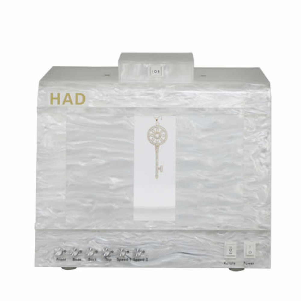 HAD 360 Jewelry Photography Studio features a built in turntable base as well as a removable aerial necklace stand. The speed of the turntable and aerial stand can be adjusted to move fast or slow.
