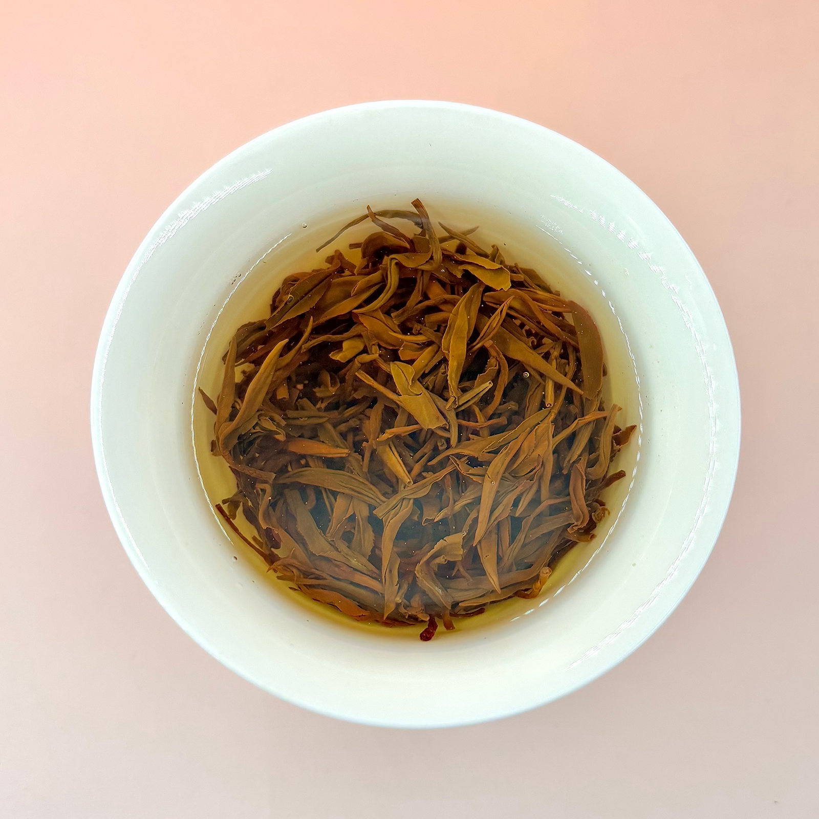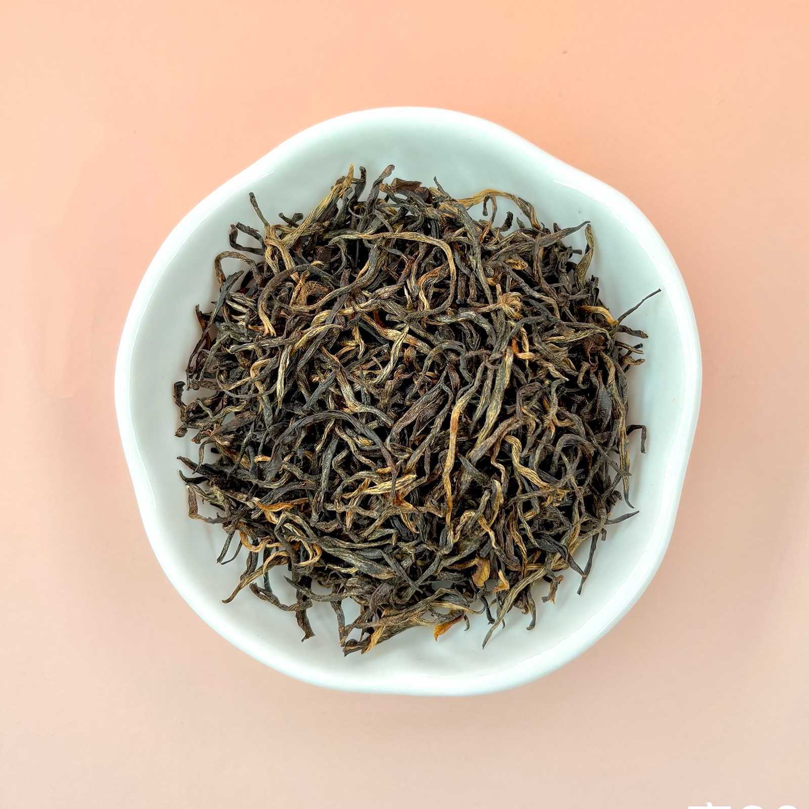 This tea features dry leaves that are tight, thin, and curly, appearing dark brown with visible pekoe, even and clean. The liquor is bright orange-red in color, offering a sweet aroma with floral notes. The taste is mellow, sweet, and refreshing. The brewed leaves are tender and soft, bright red in color, and even.