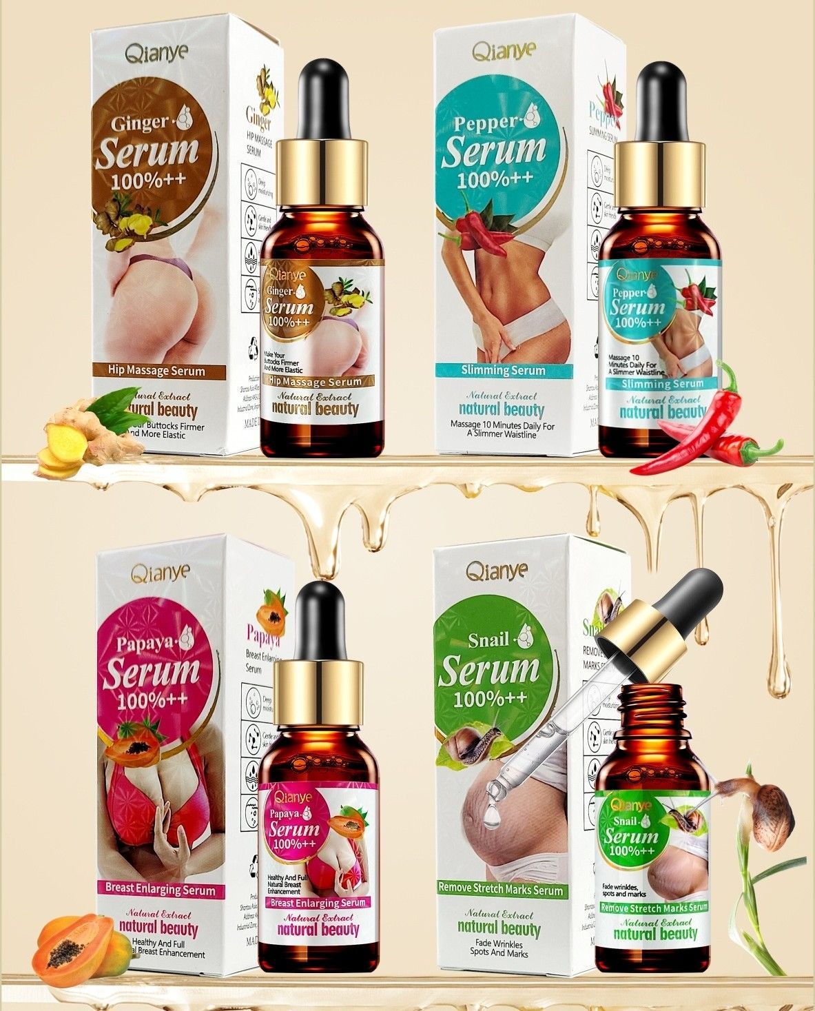 Users report that the Papaya Breast Serum provides hydrating nourishment, improving skin firmness and appearance with consistent massage. The Pepper Slimming Serum is noted for its effective warming sensation, helping to tighten areas like the abdomen and thighs. The Ginger Hip Serum offers comforting warmth and is praised for enhancing skin elasticity and brightness over time. The Snail Stretch Marks Serum is appreciated for its rich texture, aiding in fading newer marks and improving skin resilience. Most users emphasize that regular massage and a healthy routine are key to visible results, recommending a patch test for sensitive skin.