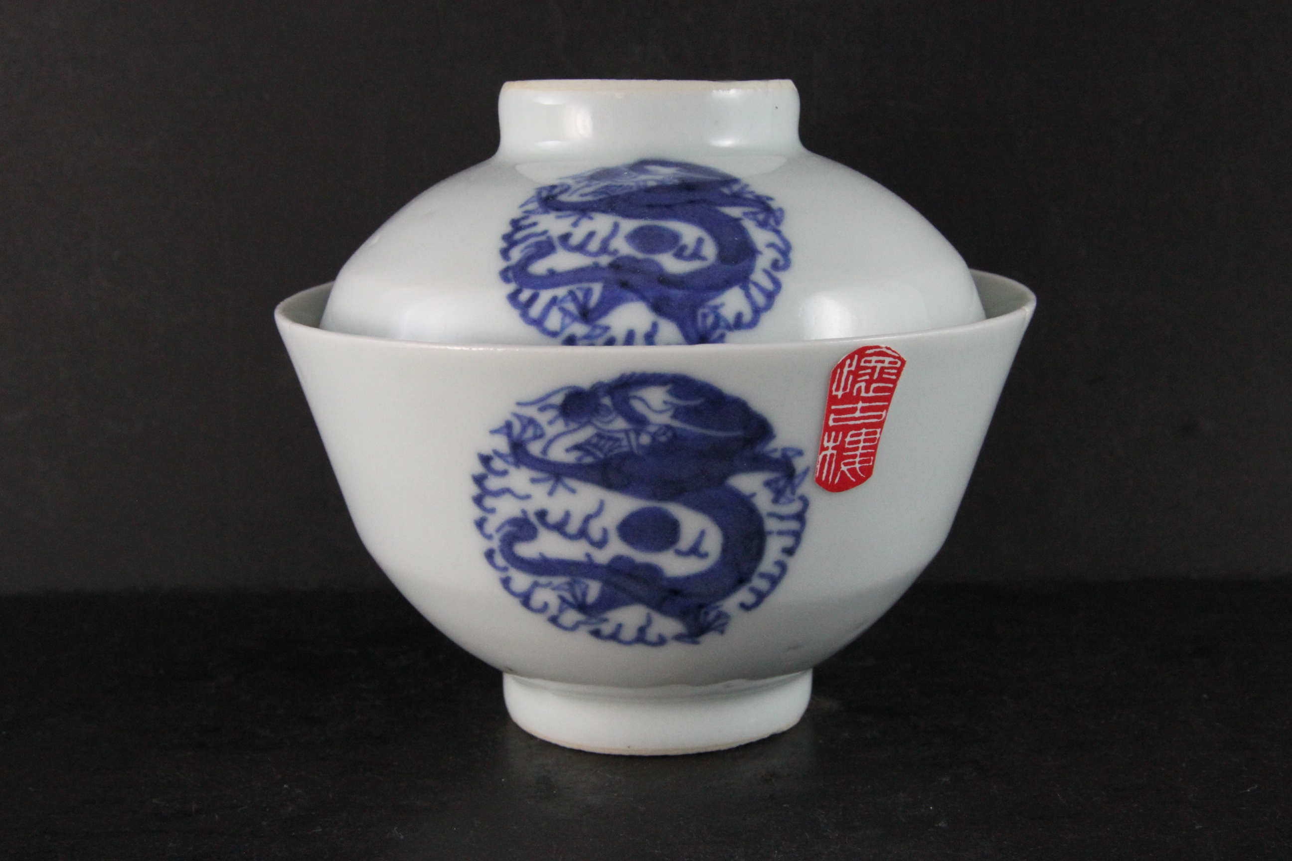 Qing Dynasty, Jiaqing Period Blue and White Covered Bowl with Dragon Design