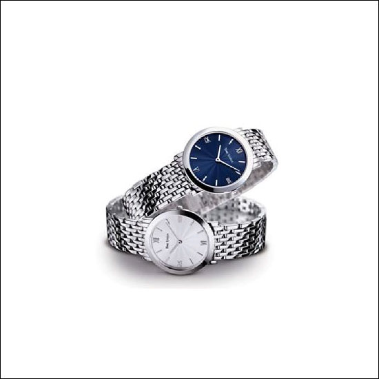 • The circular dials covered with sapphite crystal glass are either in sunray pearl white or blue.