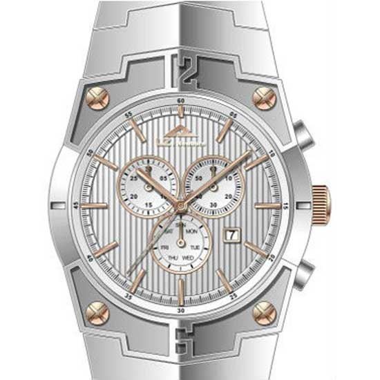 This silvery quartz analog watch flaunts a round dial with golden stick indices and hands. The date display window and 3 sub-dials lend extra functionality to the timepiece. The exquisite wristwatch is finished with a solid stainless steel band for a classy touch.