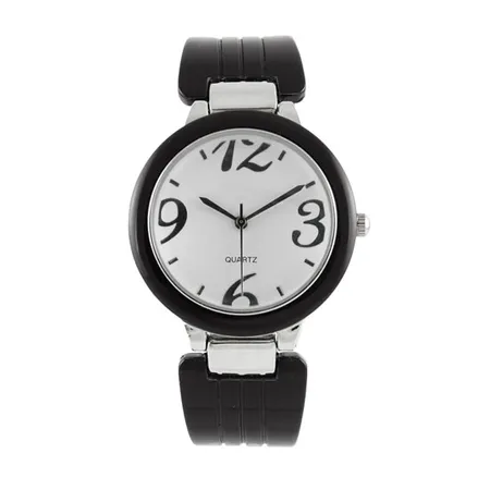 The round black alloy watch case houses a white dial with elegant Arabic numerals and index markers in this watch. The precise quartz movement and a black strap finish this classic timepiece. The fashionable watch makes a great addition to your attire.