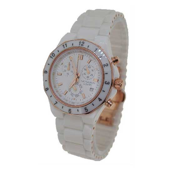 Featured is an exquisite ceramic chronograph watch designed for ladies. Rose gold colored features such as dial markers and watch hands are sophisticated and tasteful. It also emphasizes functionality with the bezel, sub-dials and date display.
