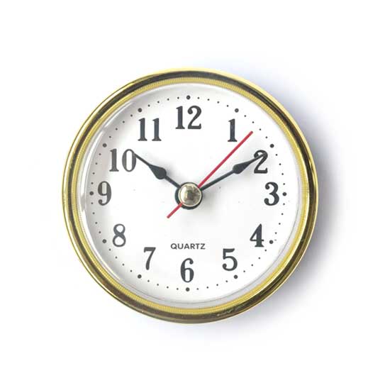 This quartz clock features a round-shaped casing in a gold-toned finish. The white dial is designed with black numeral hour markers and three watch hands. The reliable quartz clock guarantees precise time keeping.