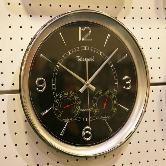 This is an analogue quartz wall clock with a sweep-second hand. It has a thermometer and a hygrometer to measure the temperature and humidity. It displays the time clearly.