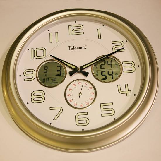 This is an analogue quartz wall clock with a sweep-second hand in a small separate dial. It is in jumbo size and has a white round dial with a matallic frame. It also has dual illuminate LED displays with Chinese character display.