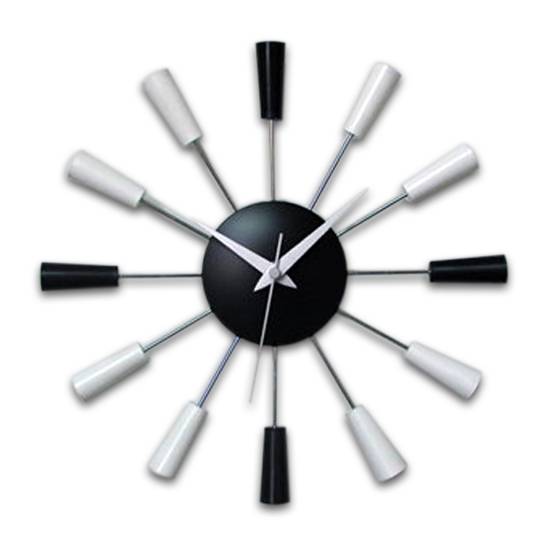 This wall clock is in black and white tone. Twelve ornaments which represent 12 numbers in time, radiate from the central round dome.