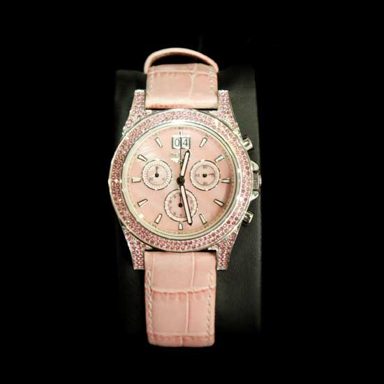 This is a fashionable quartz watch that comes with a soft leather strap in pink. The watch case is accented with sparkling stones for a decorative touch. The round dial face has three hands, three sub-dials and a date display.