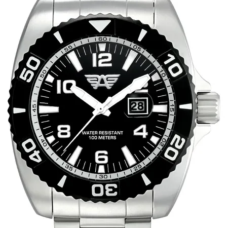 A solid construction in a sleek two-tone design, this stainless steel timepiece can withstand the extreme pressure with tested 100-m water resistance. The straightforward dial features a date window along with luminous hands and markers against a dark-shaded background. An oyster-style bracelet strap wraps around the wrist securely with curved comfort.