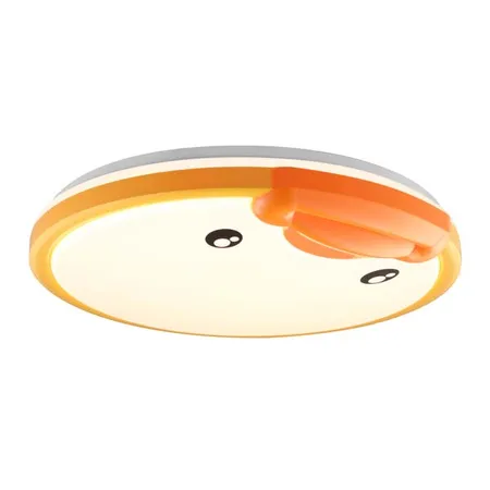 This is a ceiling light suitable for a children's room. It is round in shape and designed with a cute cartoon pattern, resembling a lovely animal face with big eyes and an orange - colored part that looks like an ear or a beak. The overall color tone is warm, with yellow and orange hues, creating a playful and cozy atmosphere for kids' rooms. When lit, it emits soft light, which is gentle on children's eyes and perfect for creating a comfortable sleeping or playing environment.