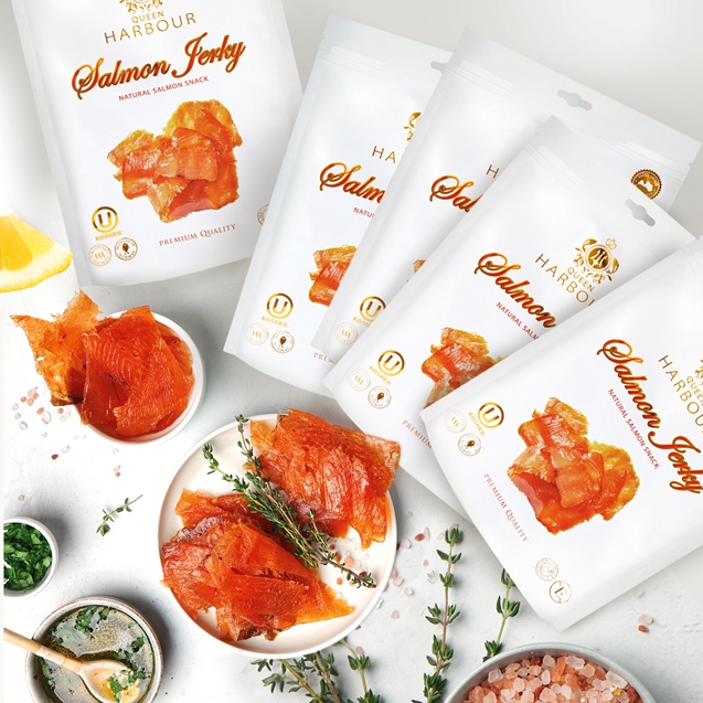 Queen Harbour air-dried smoked salmon fillet slices snacks is made from highest quality cooled Norwegian salmon. Superior quality and refined taste acquired through delicate salting and drying process carried out by hand. It is Kosher product which can be kept in room temperature and no need to freeze. You can enjoy it anywhere, anytime and also suitable for pairing with wine and beer.
