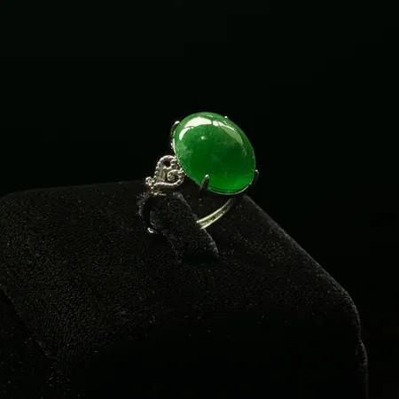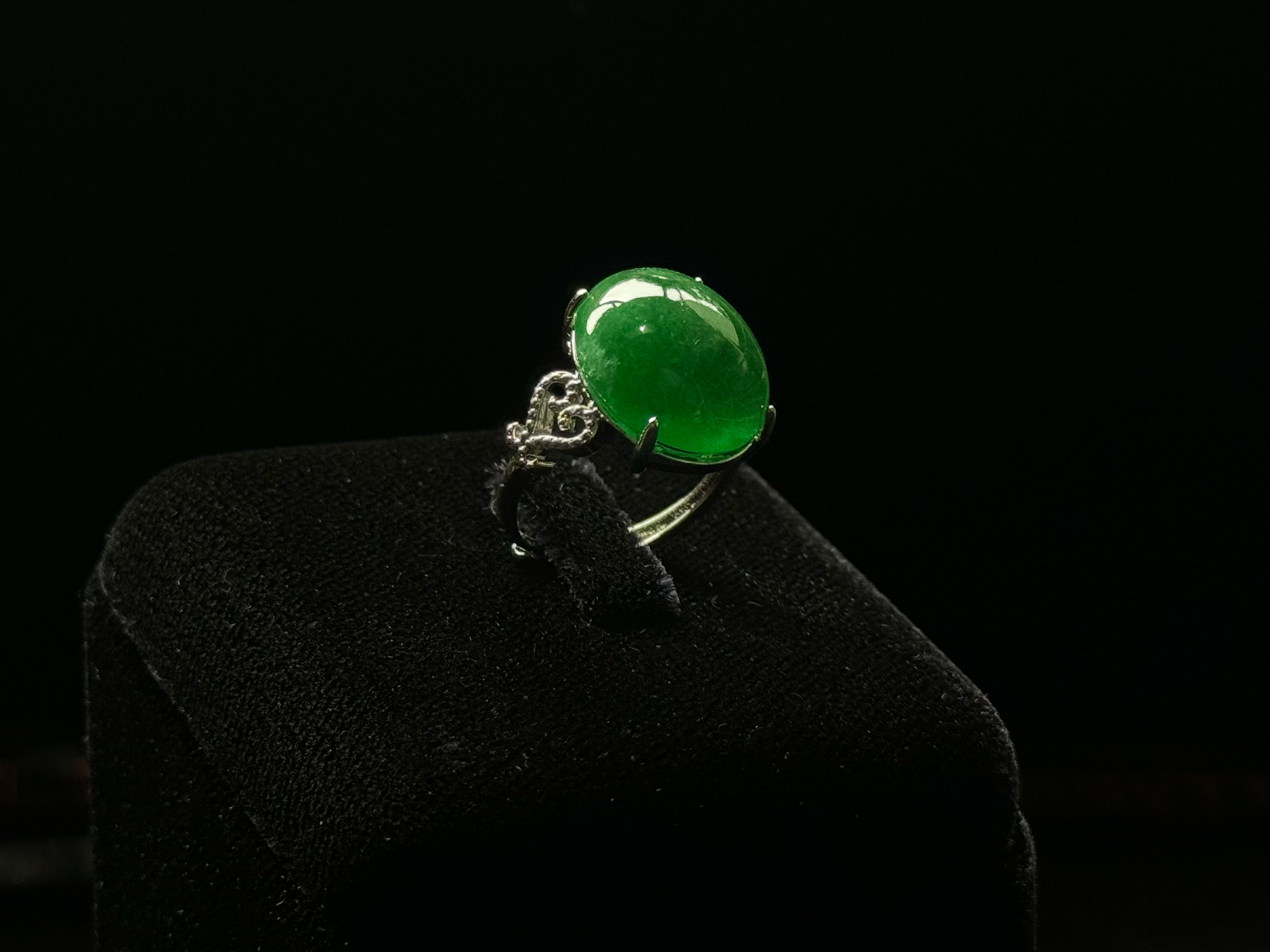 The large stone is secured by a subtle claw setting that allows maximum light to penetrate the gem. It is mounted on a slender band with an ornate detail on the shoulders, featuring delicate, scrolling filigree work on either side of the main setting. This classic design is both sophisticated and timeless, allowing the beauty and quality of the large jadeite cabochon to take center stage.