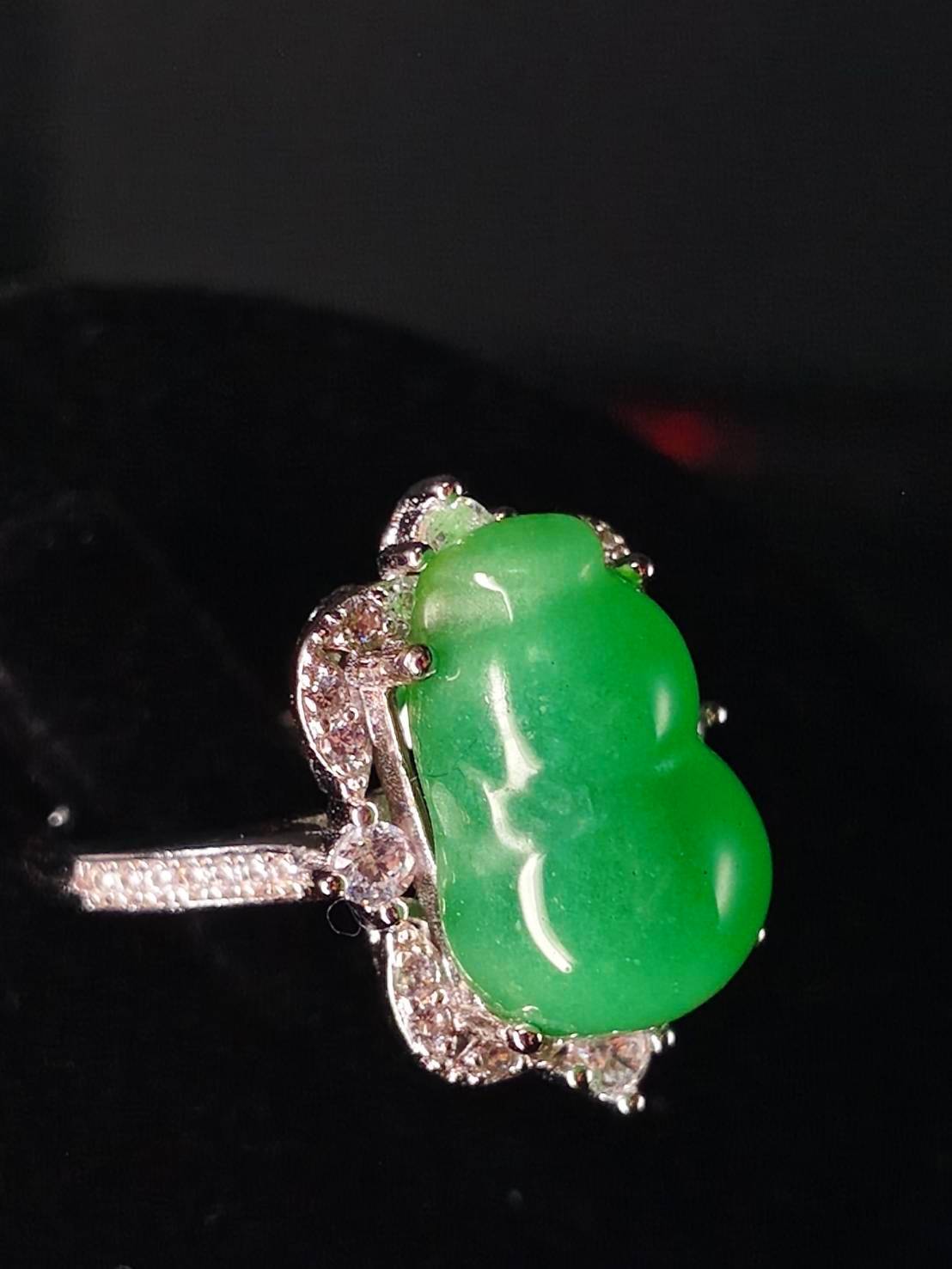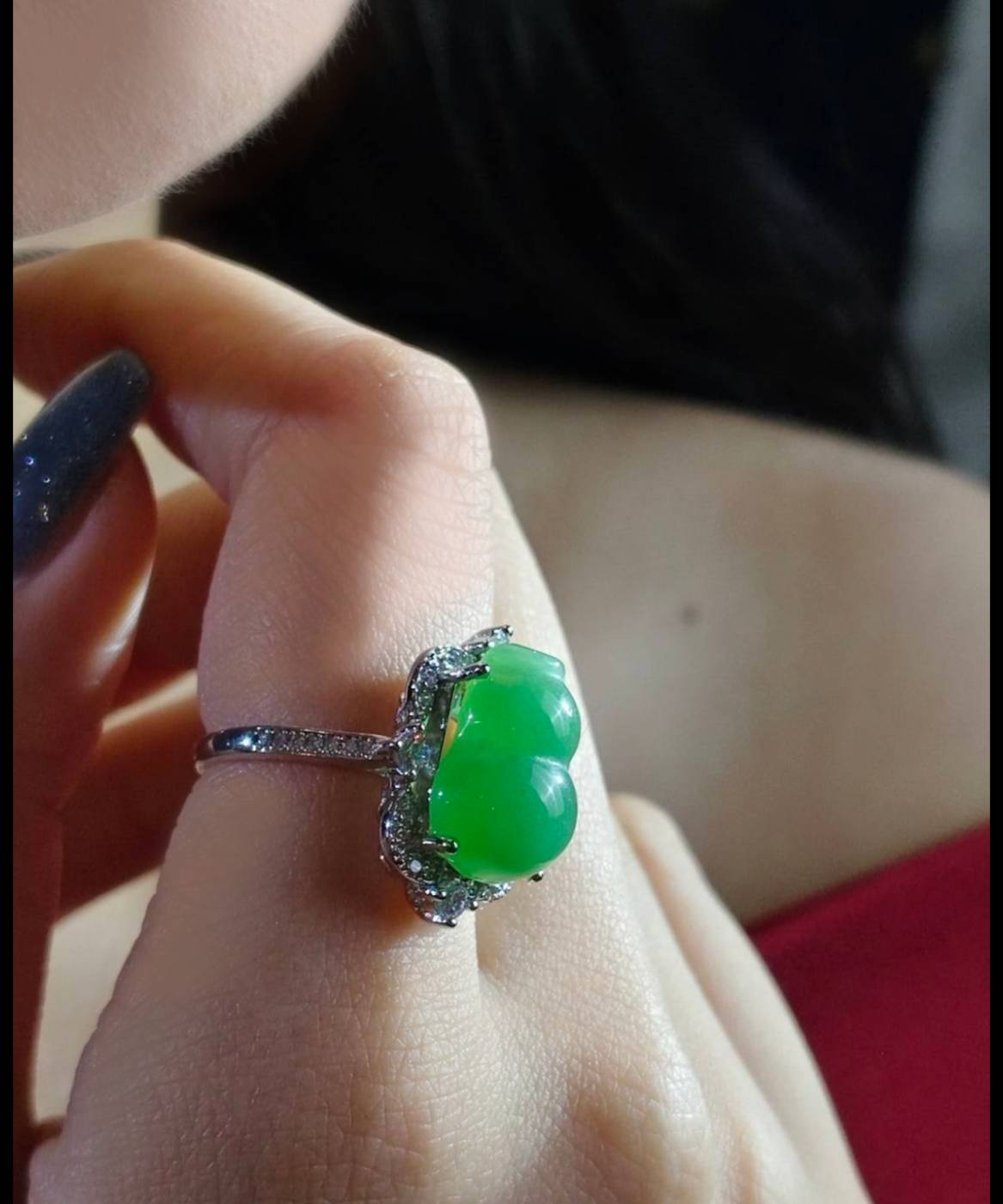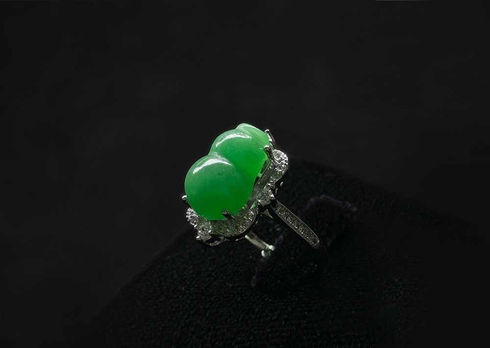 This charming ring features a unique centerpiece: a double-domed cabochon of intensely vibrant green jadeite, carved into the auspicious shape of a gourd or 'hulu'. This central piece is highly polished, giving it a luminous, flowing appearance.