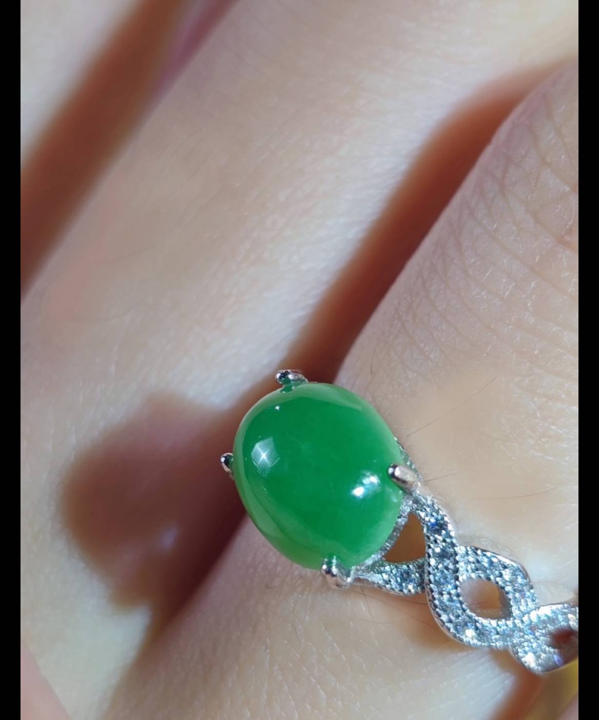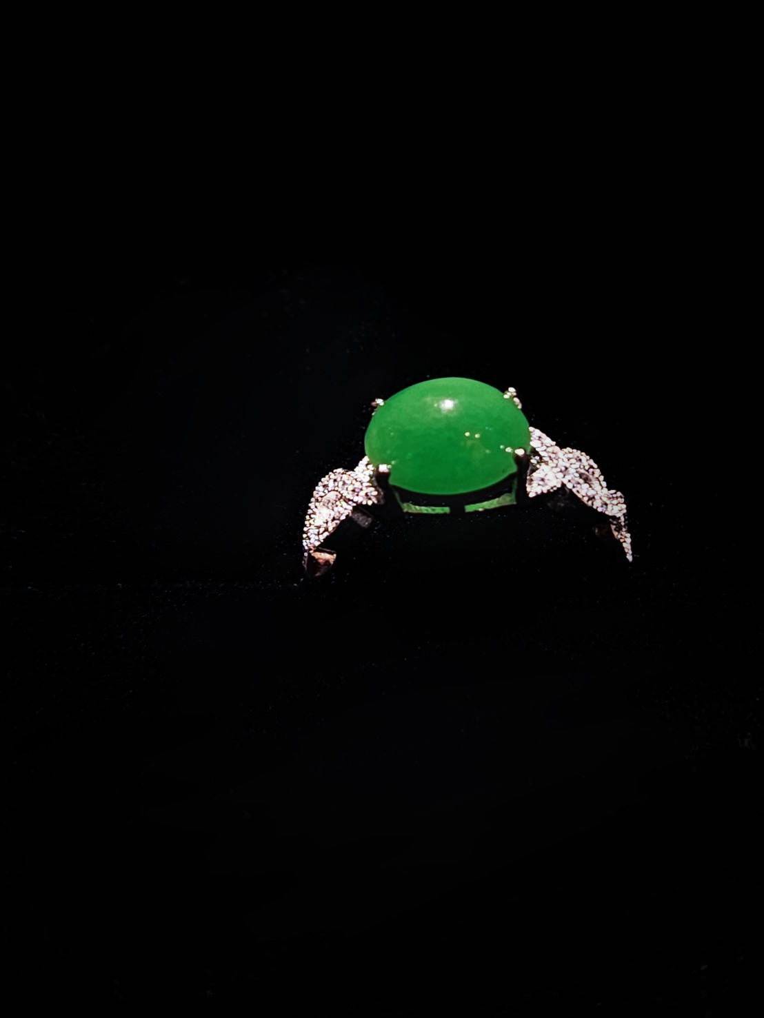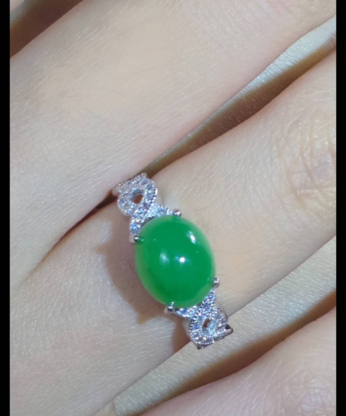 This stunning ring showcases a central, oval cabochon of intensely bright green jadeite, which is mounted horizontally and secured by elegant prongs. The jadeite stone has a smooth, highly polished surface, giving it a luminous, almost wet sheen.