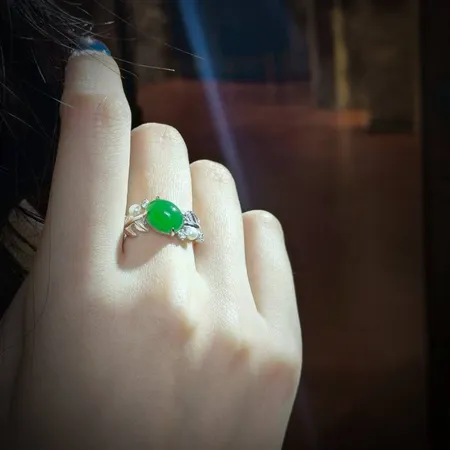 This is an elegant ring with a vibrant design, full of life. At the center of the ring is an oval-shaped Imperial Green or Bright Green Jadeite, whose rich, saturated color and lustrous sheen make it the visual focal point. The mounting on both sides of the main stone is designed as delicate leaf motifs, accentuated with small diamonds or crystals to add brilliant sparkle. Next to the leaves, a small, round white pearl is set on each side, softening the overall lines. The ring perfectly combines the opulence of jadeite, the brilliance of diamonds, and the gentleness of pearls, presenting a fresh yet noble Oriental aesthetic.