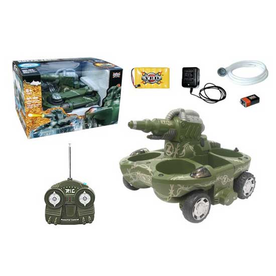 This wheeled R/C toy vividly features the design of an amphibious tank. The thoughtfully designed R/C amphibious tank is able to squirt water from its barrel. It can also perform 360-degree spin and generate flashing light.