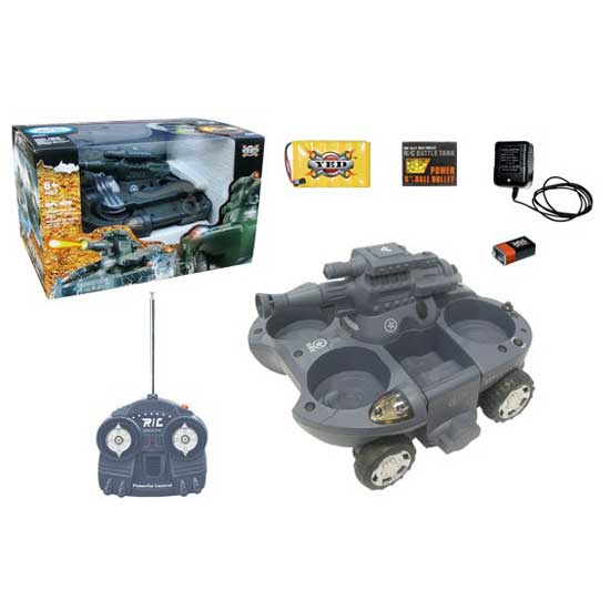 This R/C amphibious tank features a rigid gray-colored housing with four large wheels. The versatile amphibious tank can perform 90° pop-ups, 360° spins and sway from left to right. The twin LED headlights emits colorful and flashing light for added fun.