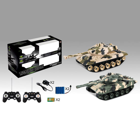 Displayed is a R/C toy tank coming with a camouflage pattern for a military look. It is carefully manufactured to give off realistic sound and light effects. The full function remote control boasts an ultra-wide effective range.