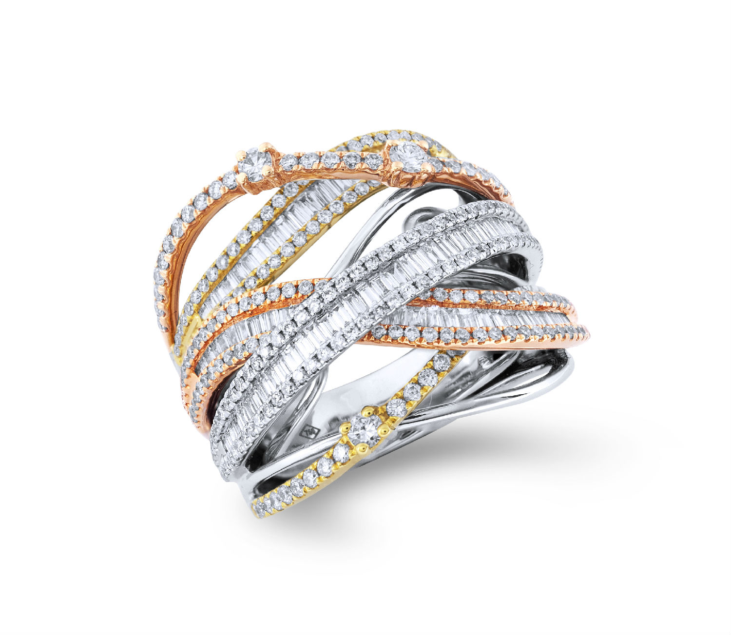 • Tri colour Karat Gold Ring set with Tapper and Brilliant round Diamonds