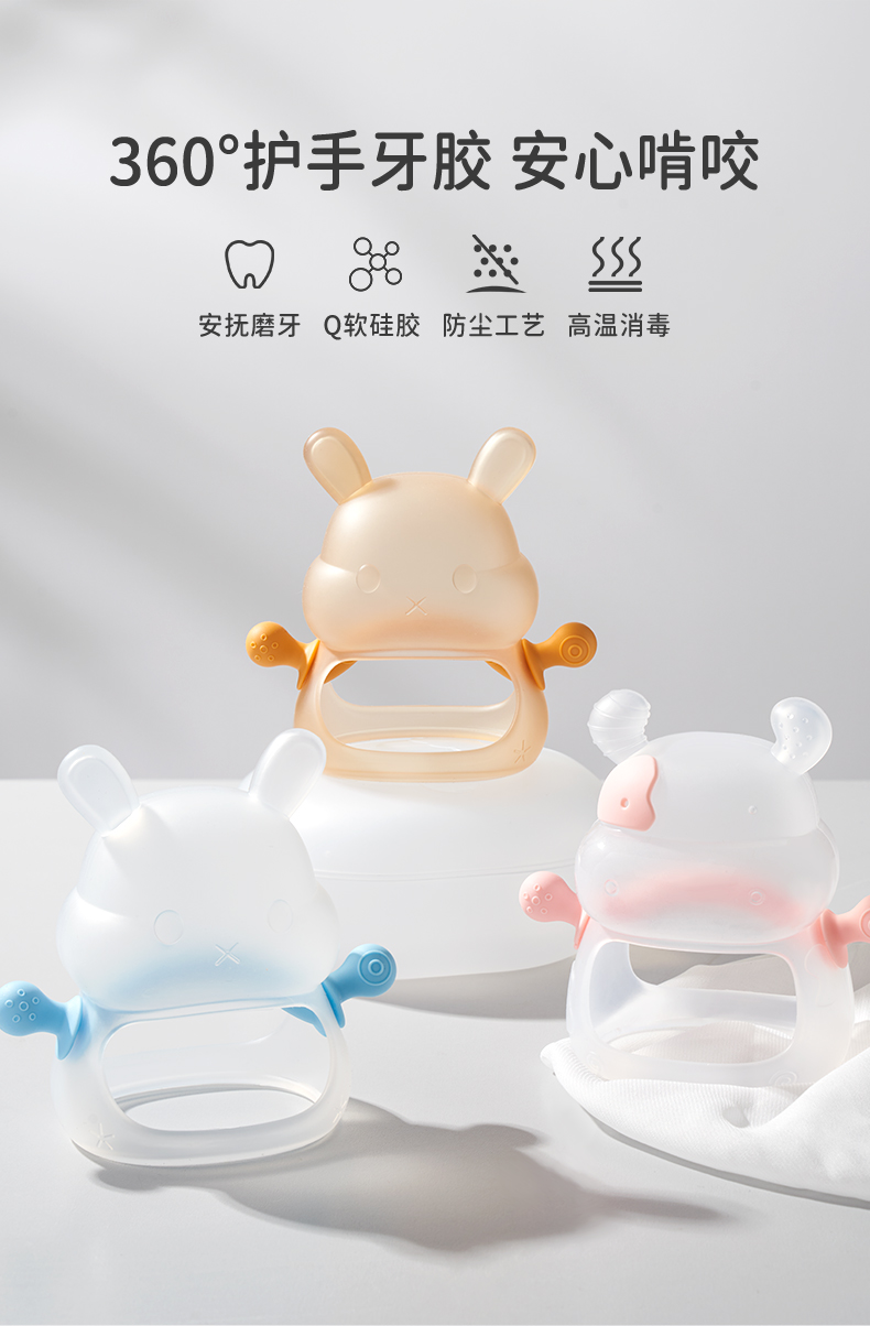 Food grade silicone material, soft, with the overall round animal shape more childlike and cute, simple lines in line with modern fashion trends, translucent materials make products make products more quality. This product is designed with four bite heads to enrich the oral function of children