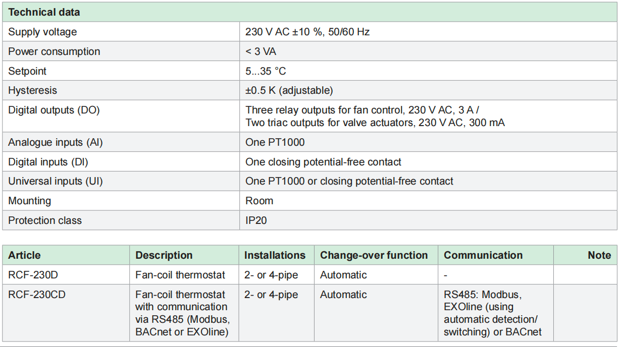 Electronic fan-coil thermostats for room temperature control. Automatic or manual changeover between heating and cooling. The thermostats have a function for 3-speed fan control (for fan-coil), a built-in temperature sensor, backlit display, and an input for a window contact or an occupancy detector.
