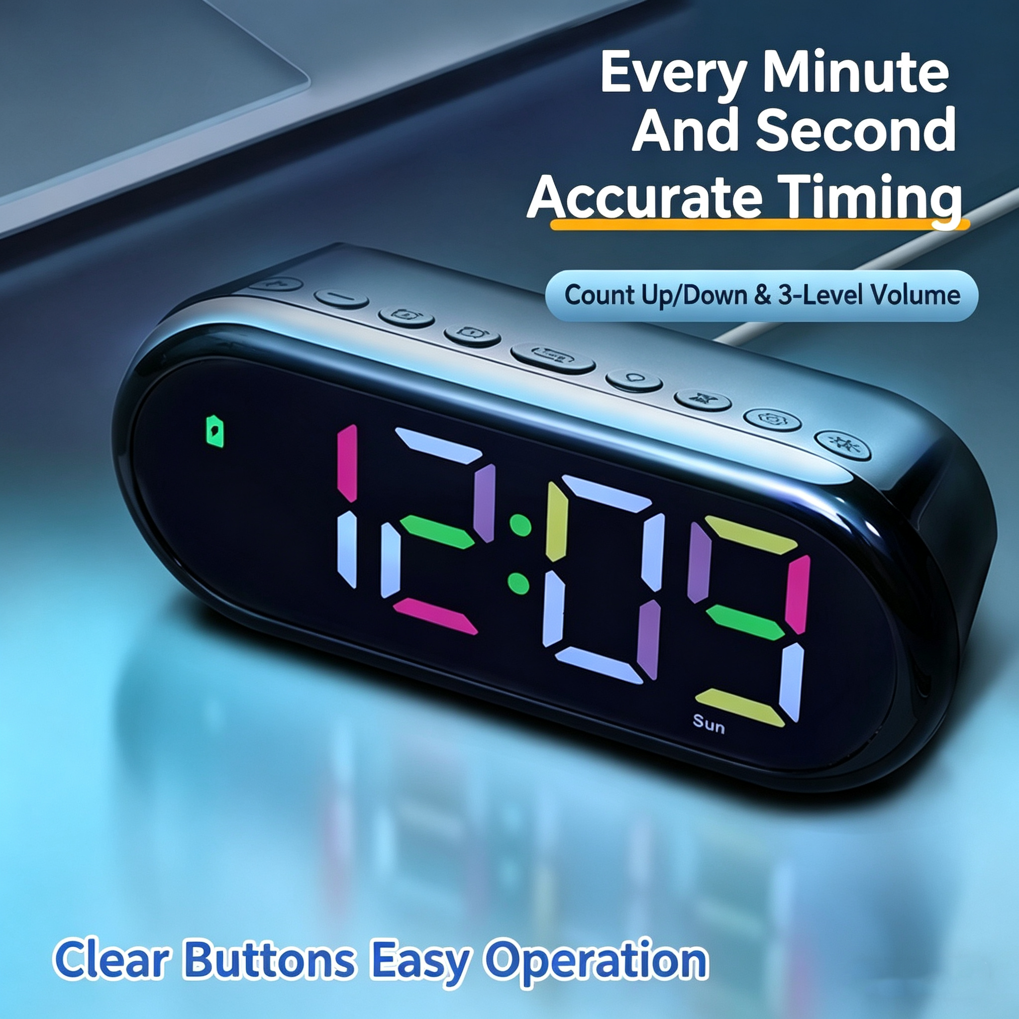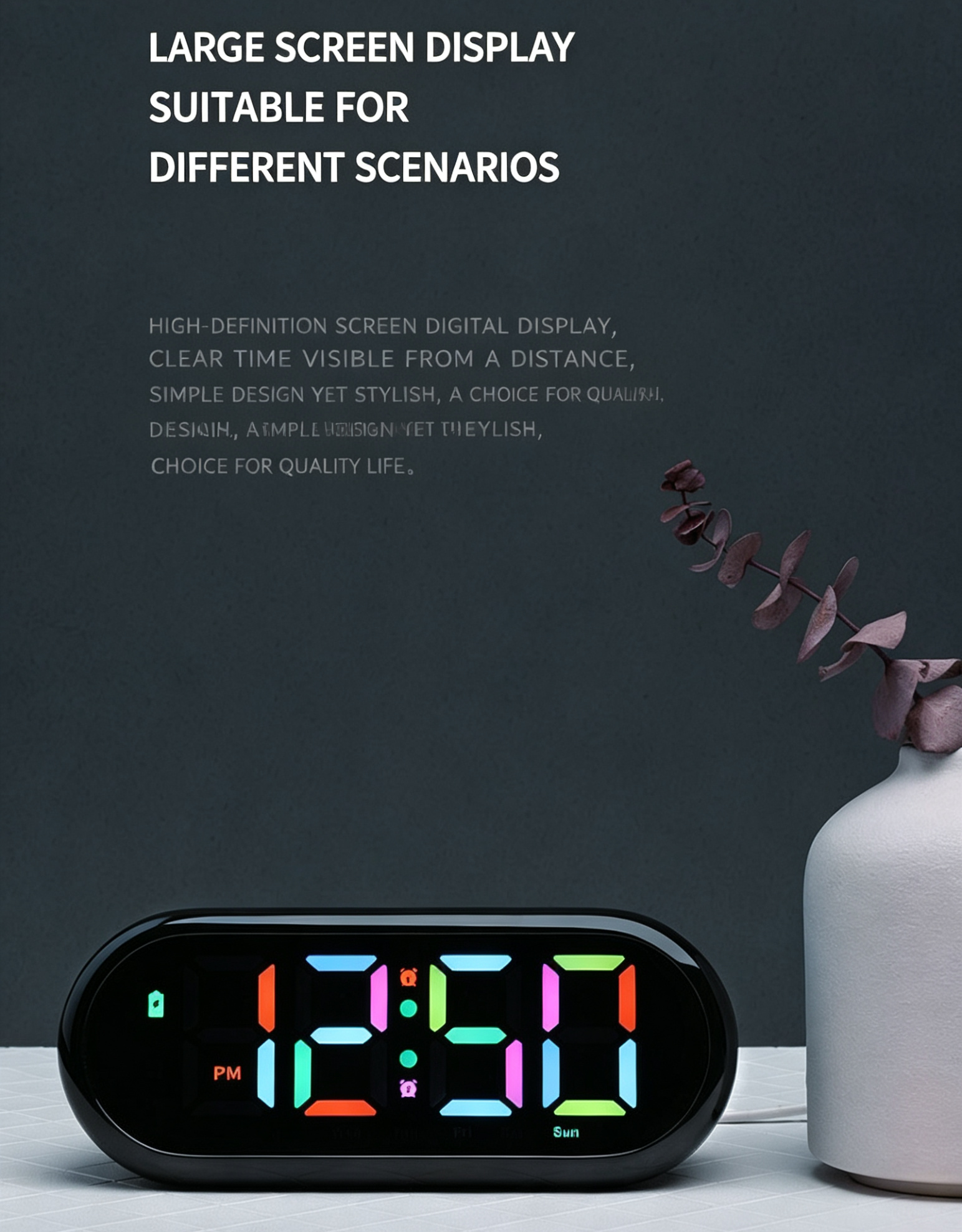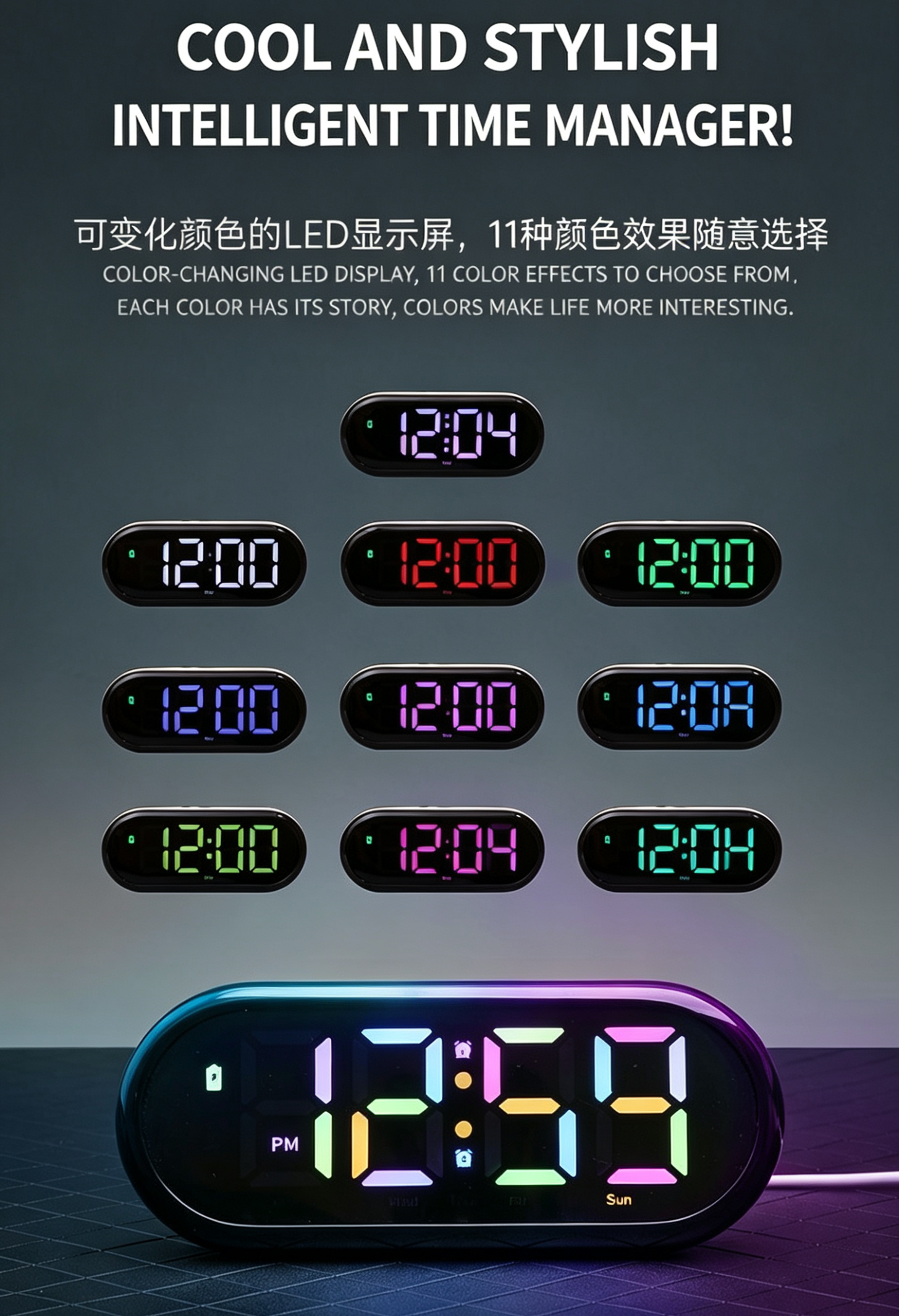 - RGB Dynamic Color Display: Enjoy 11 vivid color modes to match your mood or room decor. The colorful LED screen ensures clear time visibility from any angle.