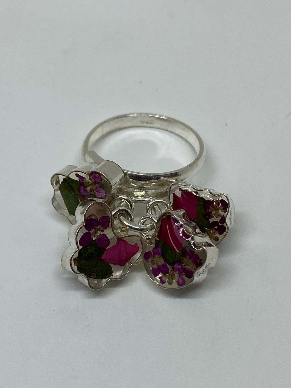 .925 SILVER CHARM RING WITH ENCAPSULATED FLOWERS