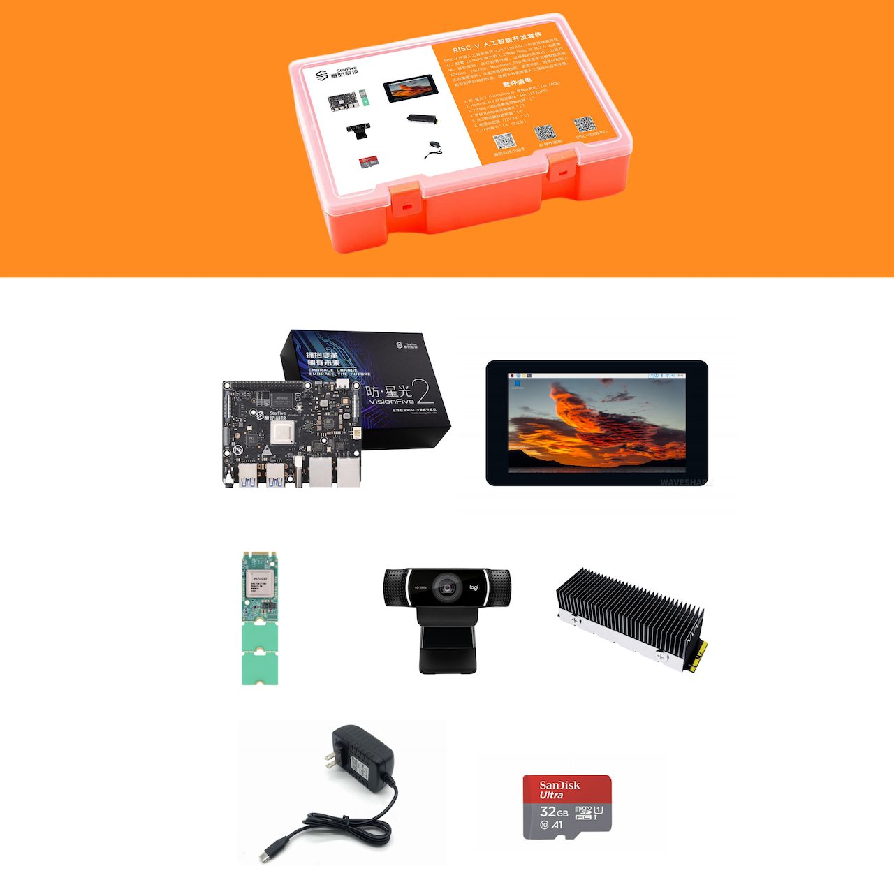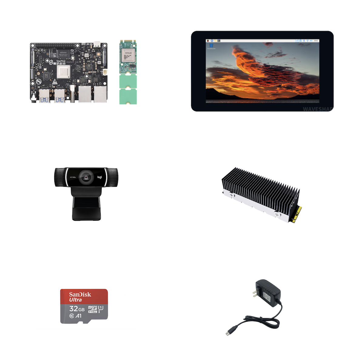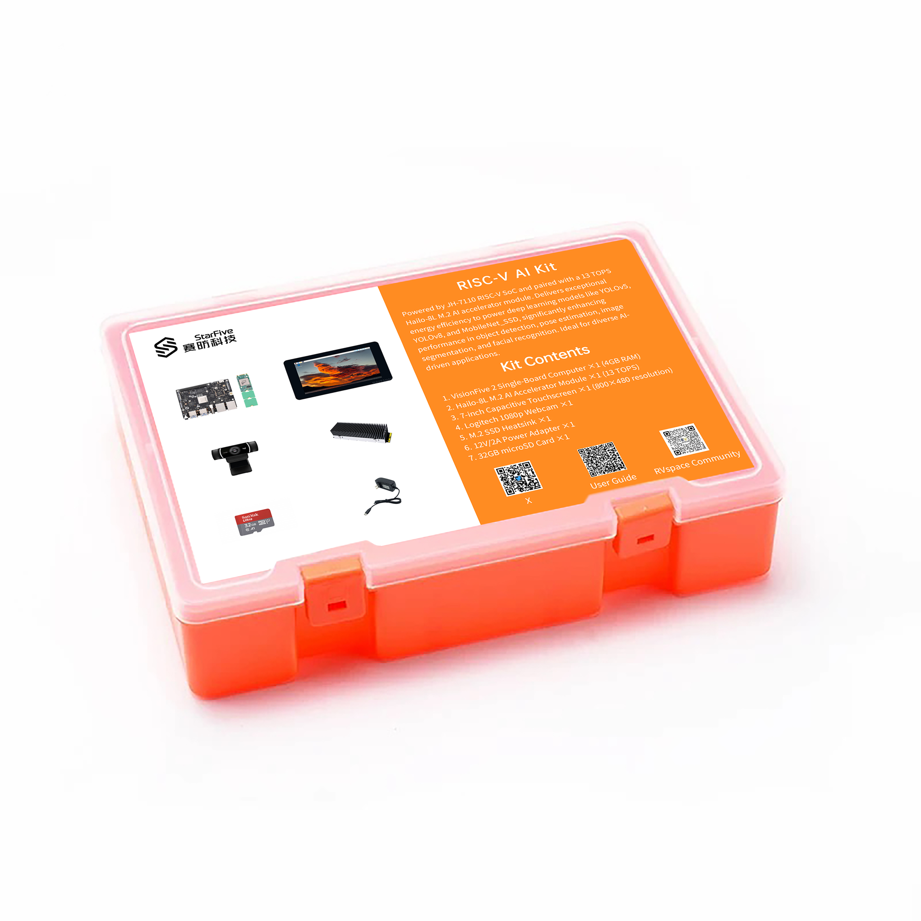 RISC-V AI Kit includes: VisionFive 2 SBC (4GB RAM) ,13 TOPS Hailo-8L M.2 AI Accelerator Module,7-inch Capacitive Touchscreen (800×480 resolution) ,Logitech 1080p Webcam,M.2 SSD Heatsink,12V/2A Power Adapter (for board) ,32GB TF Card.