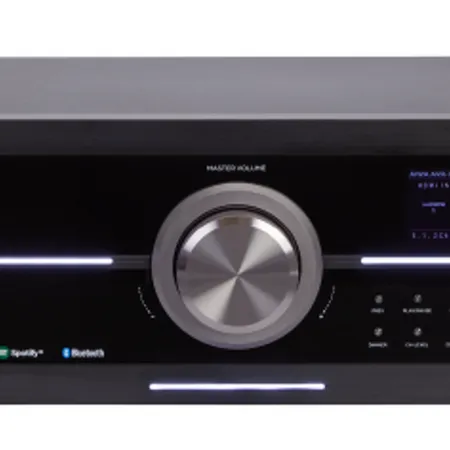 7.2CH Audio Video Receiver with built-in amplifier delivering up to 180W per channel at 4 Ohms, supporting Dolby Atmos, 4K UHD pass-through, Apple AirPlay 2, and Bluetooth 5.2. Features include HDMI eARC/CEC, Wi-Fi for Spotify, a 2.4" TFT display, and multiple input/output options including 4 HDMI In, 2 HDMI Out, USB, and subwoofer pre-outs.