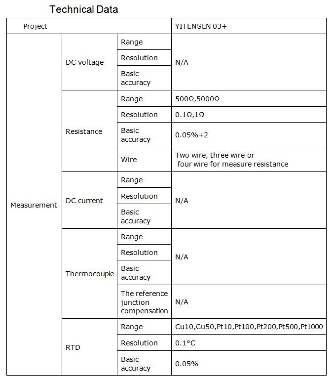 Can be two-wire, three-wire, four-wire system of 7 kinds of thermal resistance(Pt10 / Pt100 / Pt200 / Pt500 /Pt1000 / Cu10 / Cu50) measurements and resistance (400Q / 40000) measurements.