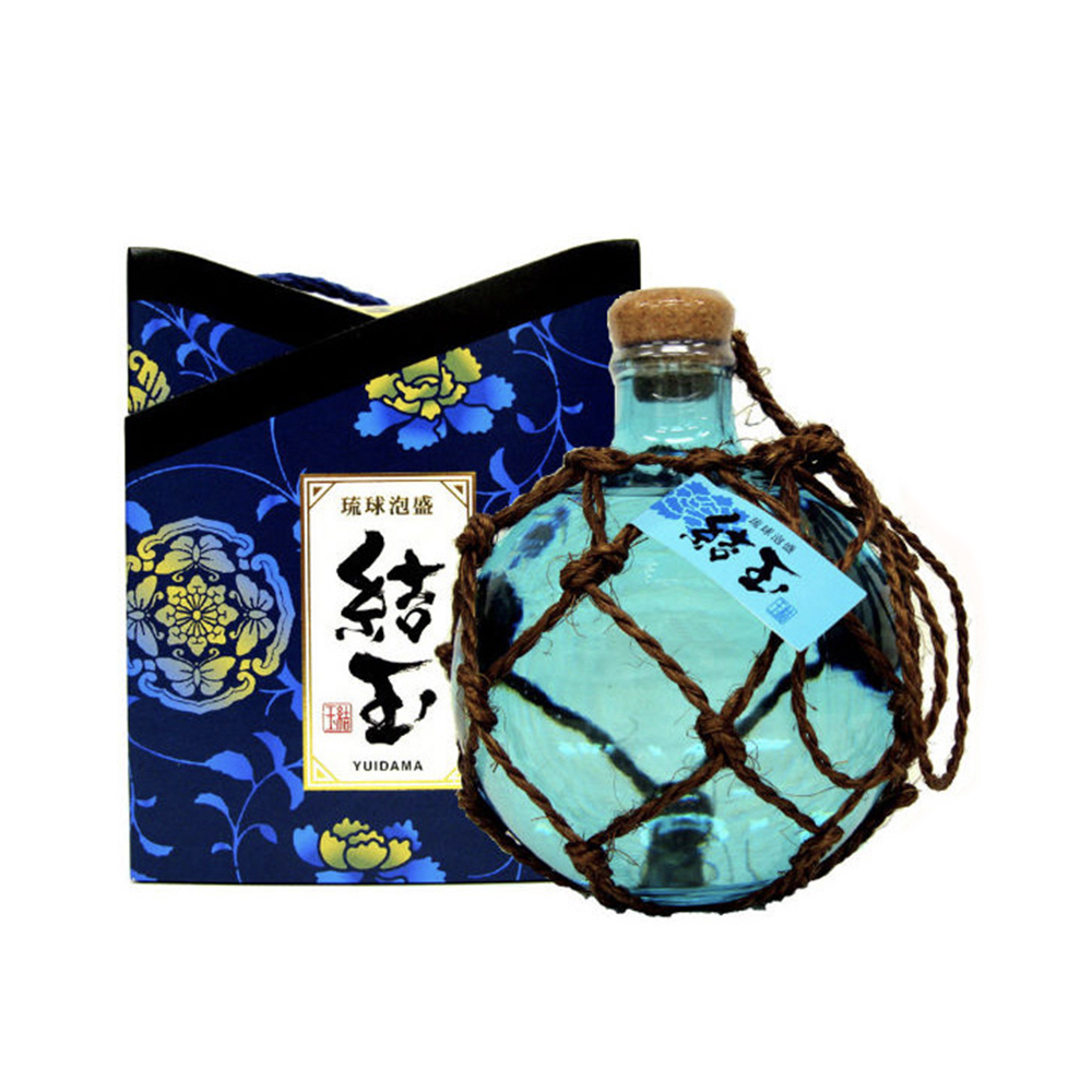 The design of the sphere shape is inspired by the blue sea of Okinawa and a traditional Ryukyu dyeing technique. Bingata is the clothing of the Ryukyu royal family and warriors. A finely woven rope net wraps the delicate glass bottle, which contains awamori made using traditional techniques and room temperature distillation. While waiting for awamori to become more mellow, the glass bottle is an elegant accessory for interior decoration.