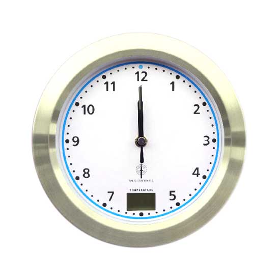This is a radio-controlled bathroom clock that boasts a durable plastic casing and an aluminum rim. The white dial face is designed with three black hands and an Arabic numeral display. The indoor temperature in ℃/℉ is displayed in the position of 6 o'clock.