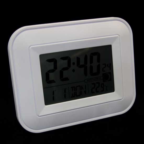 Showcased is a digital clock designed in a cool all-white style. The digital display shows the time, calendar and moon phase clearly. The alarm clock comes with a snooze function for convenience.