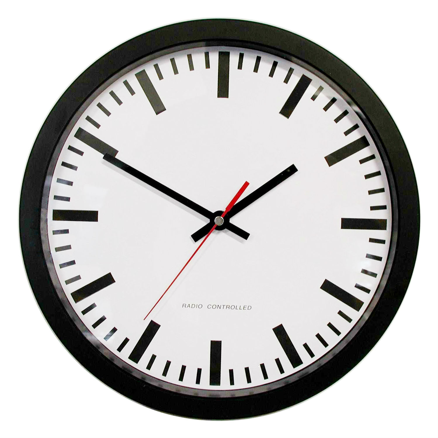 Radio controlled, plastic case, diameter 30cm, white dial with bars, 3 hands.