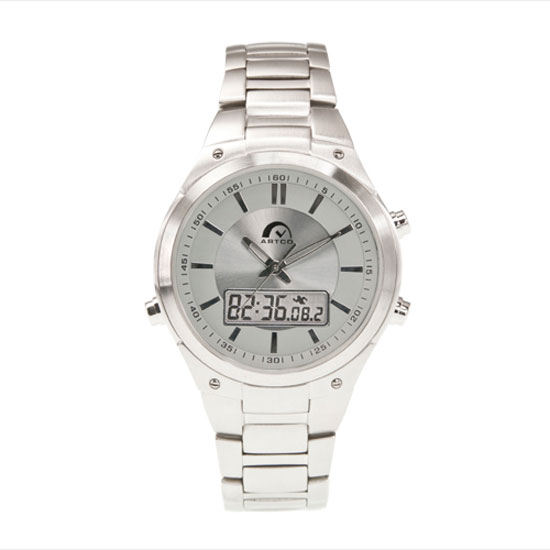 Showcased here is a radio-controlled watch. A metallic finish gives this watch a clean, classy look. This radio-controlled watch makes a reliable and practical timepiece for a number of occasions.