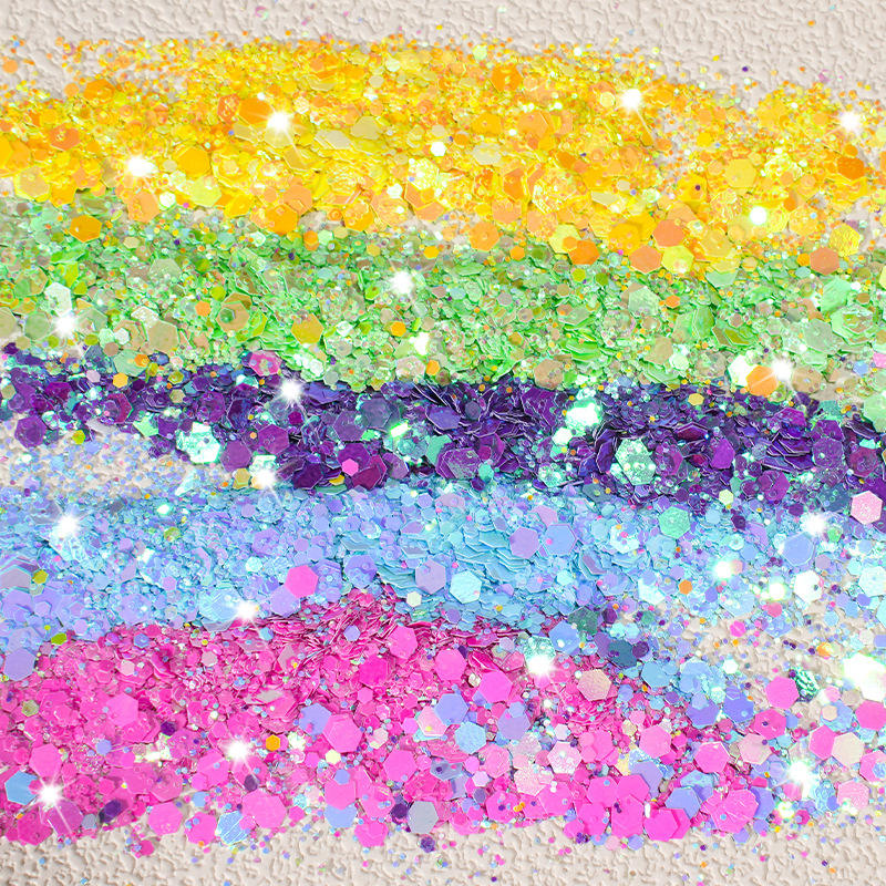 Exclusive iridescent color series + laser optical film, light refraction presents dynamic gradient effect, over 20 irregular shapes such as four corners, snowflakes, hearts, etc. to choose from, particle size as low as 0.004mm (as fine as dust)