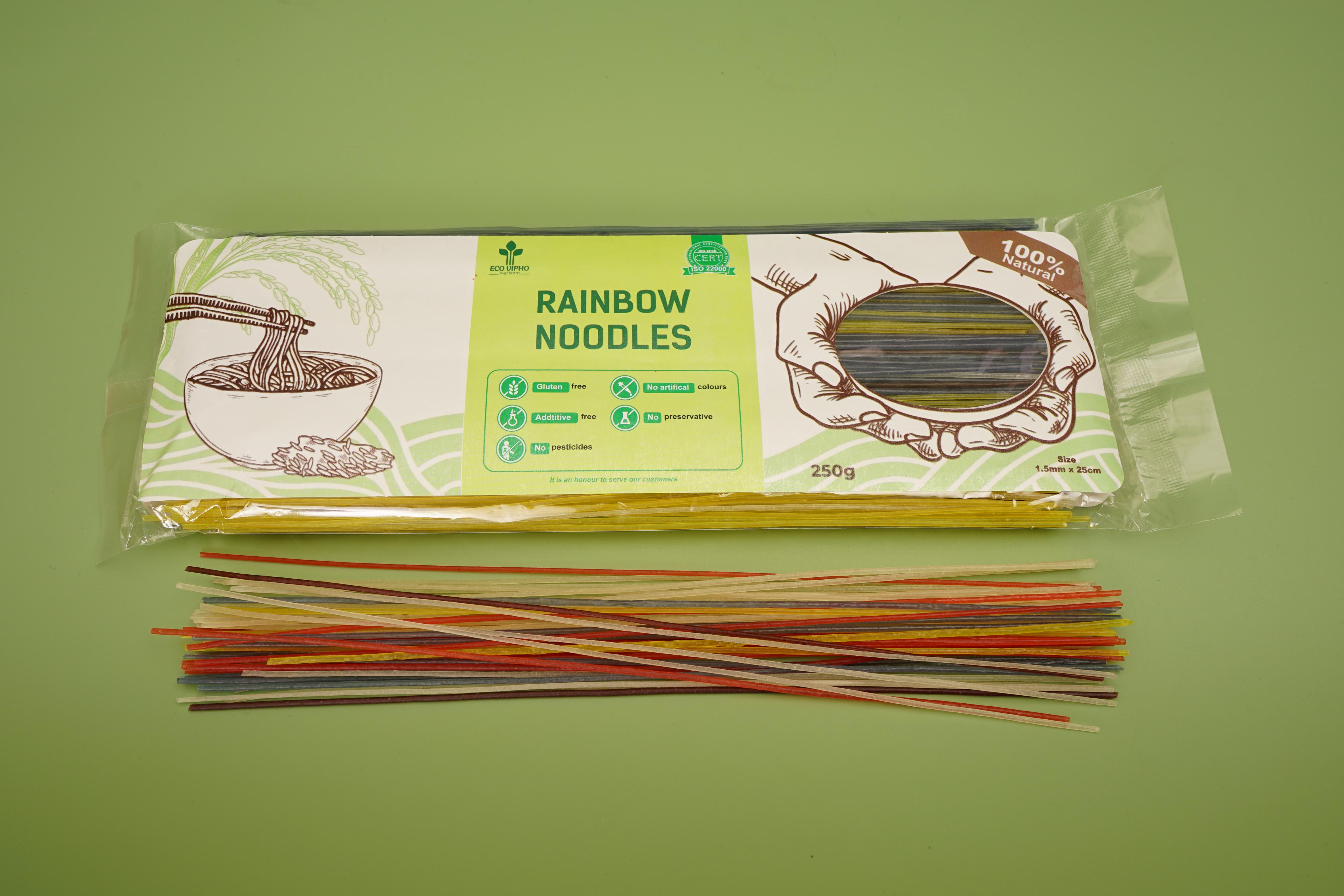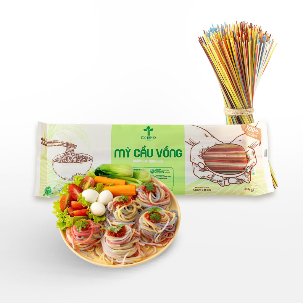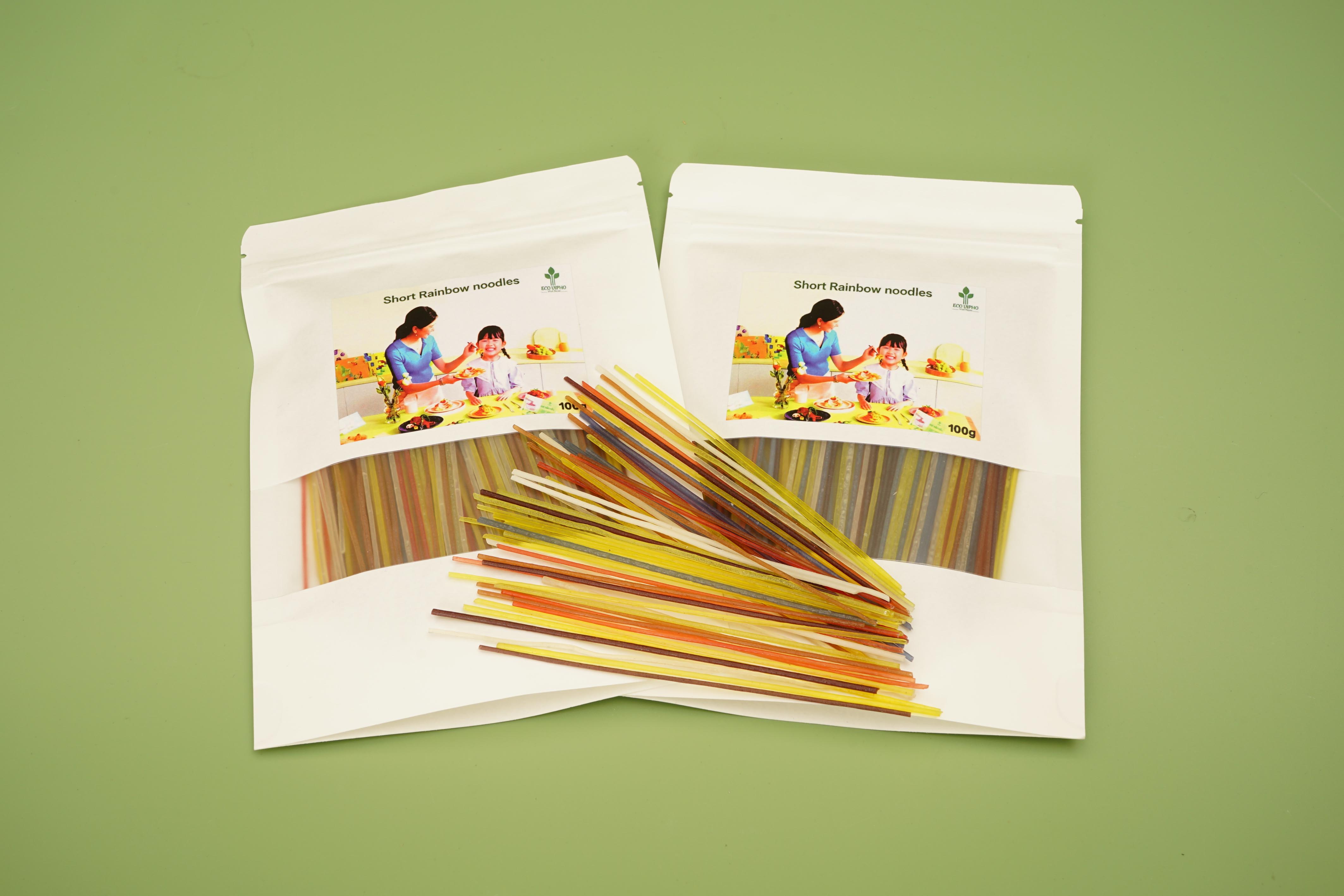Eco VIPHO Nutritional Rainbow Noodles are made from 7 types of natural vegetables and grains: butterfly pea flower, turmeric, moringa, black rice, cocoa, white rice, and red rice. Not only do they provide abundant nutrition, but they also add eye-catching colors to your meals.