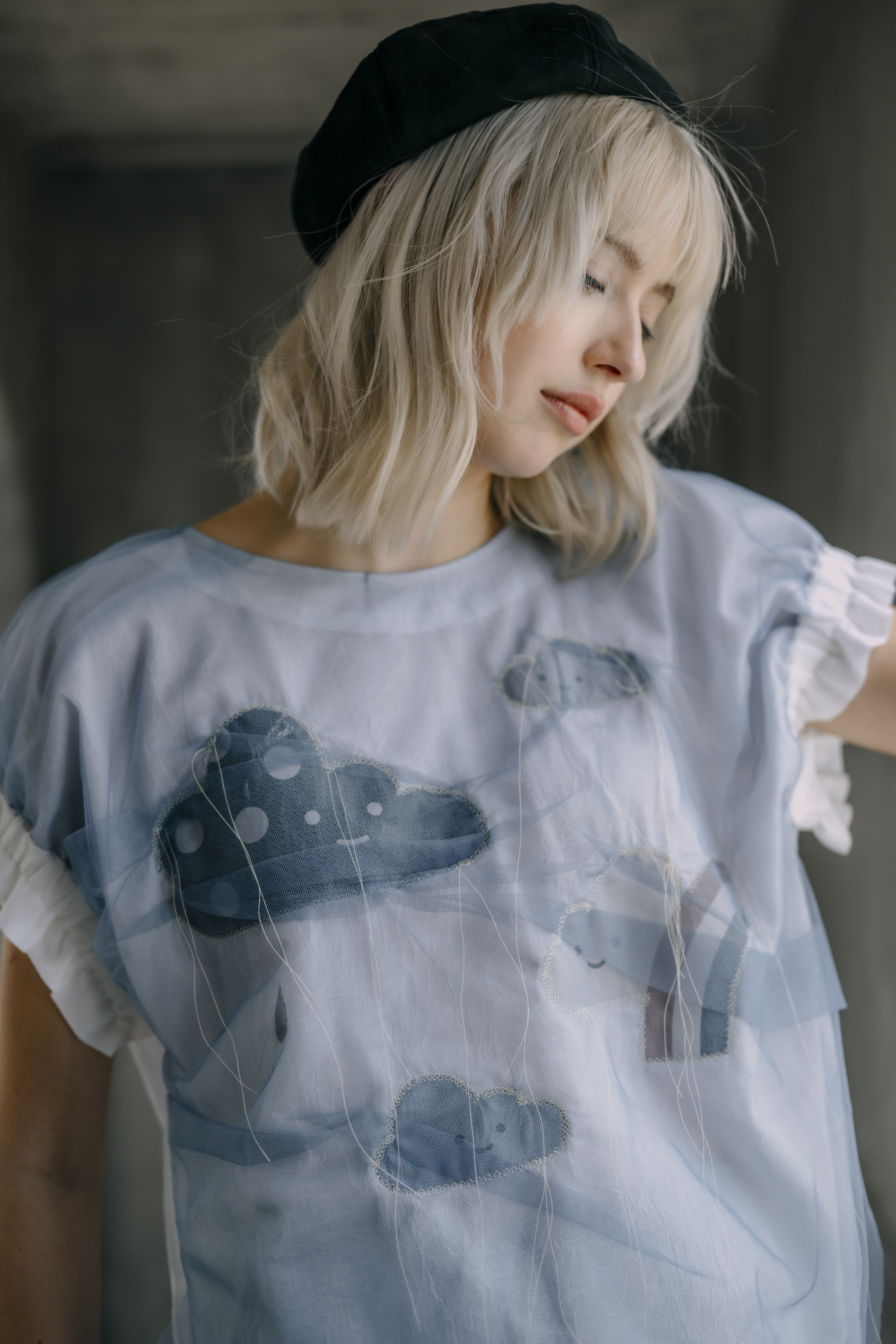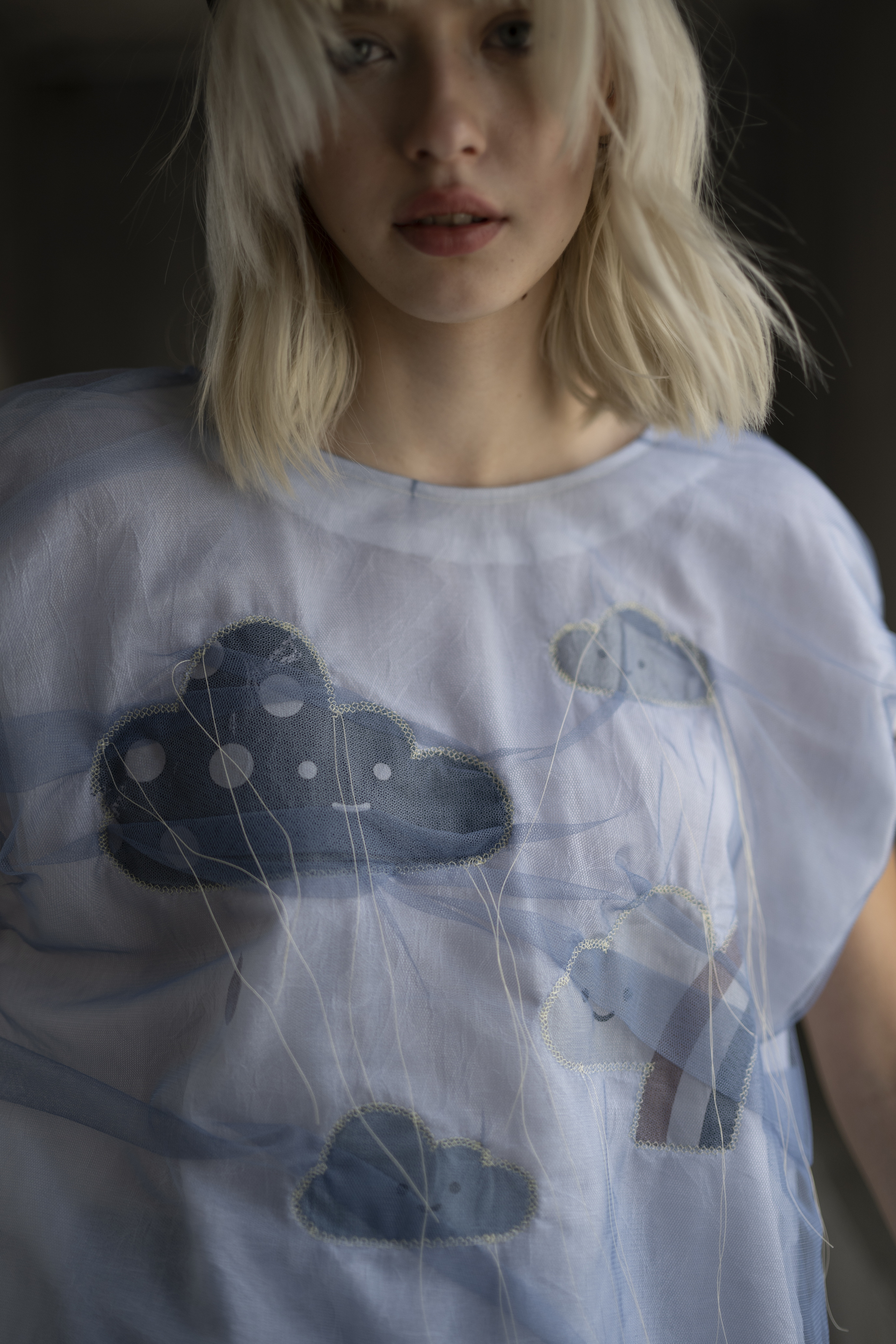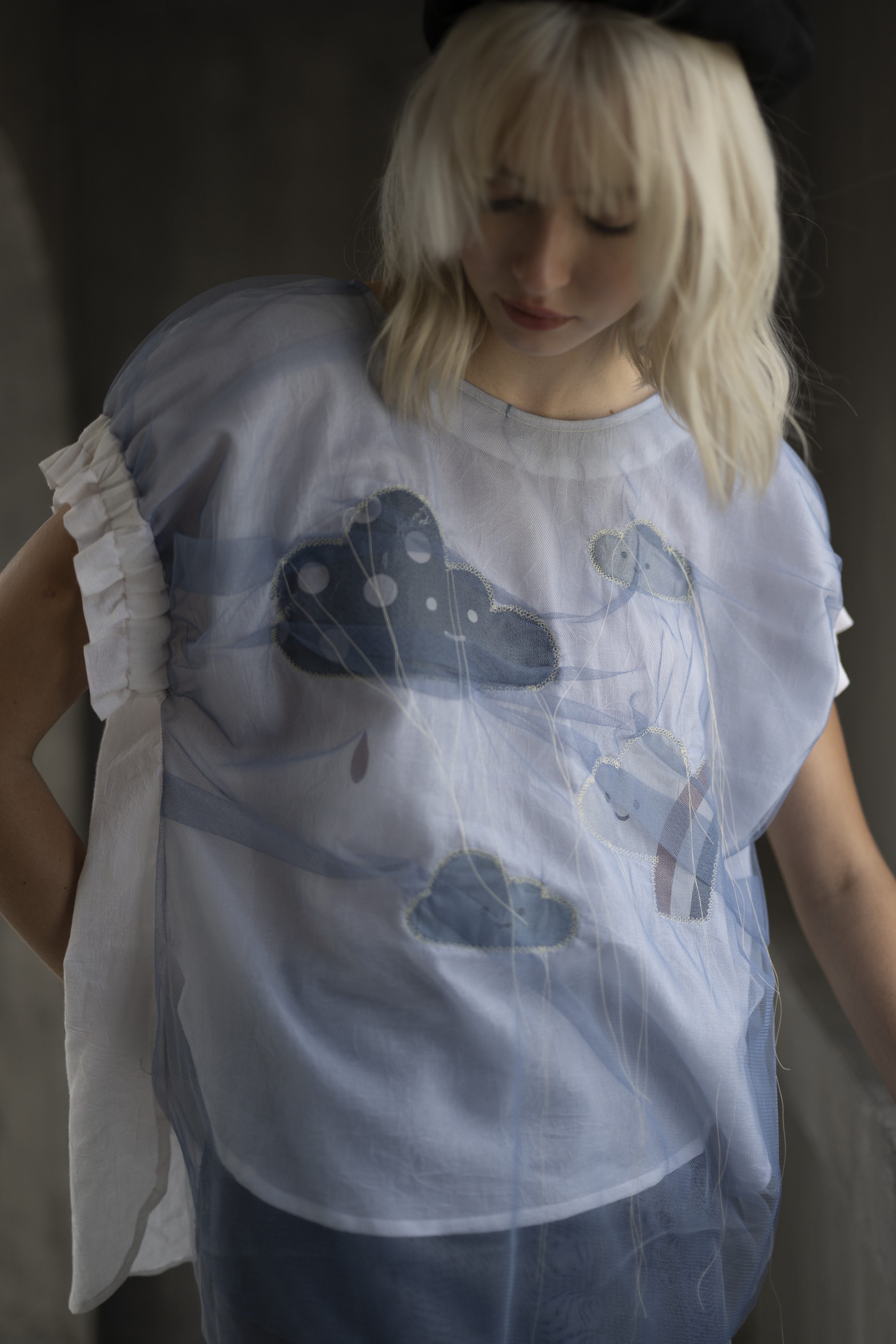 Rainlight cloud top in cotton with navy sheer overlay, featuring a digitally printed cloud motif.