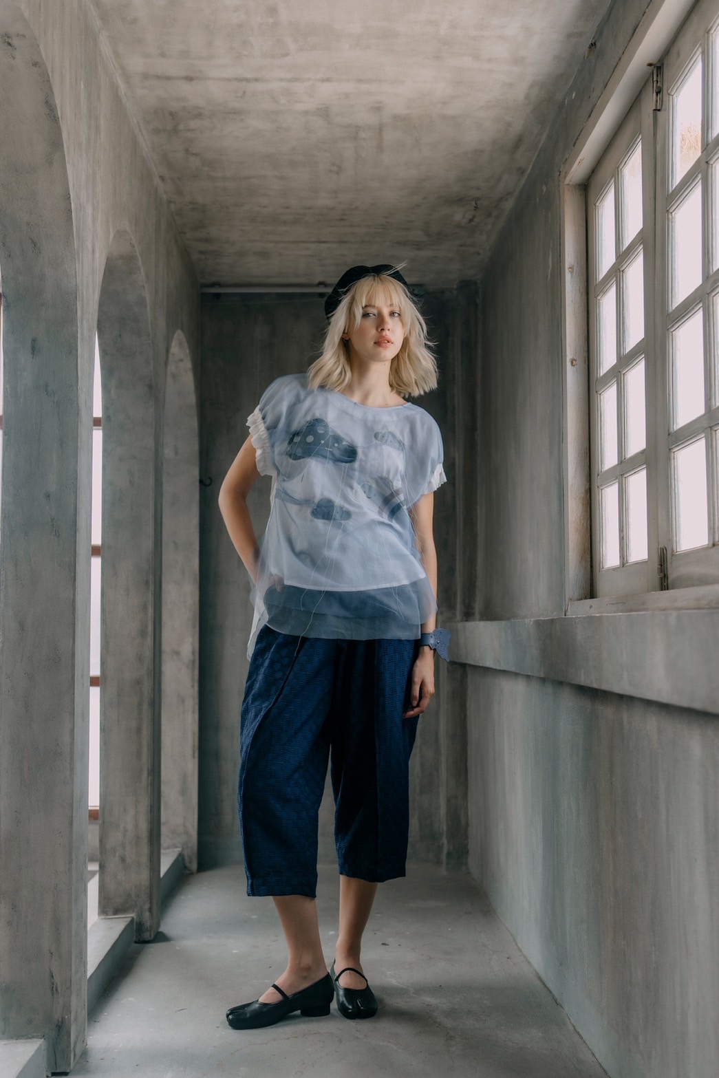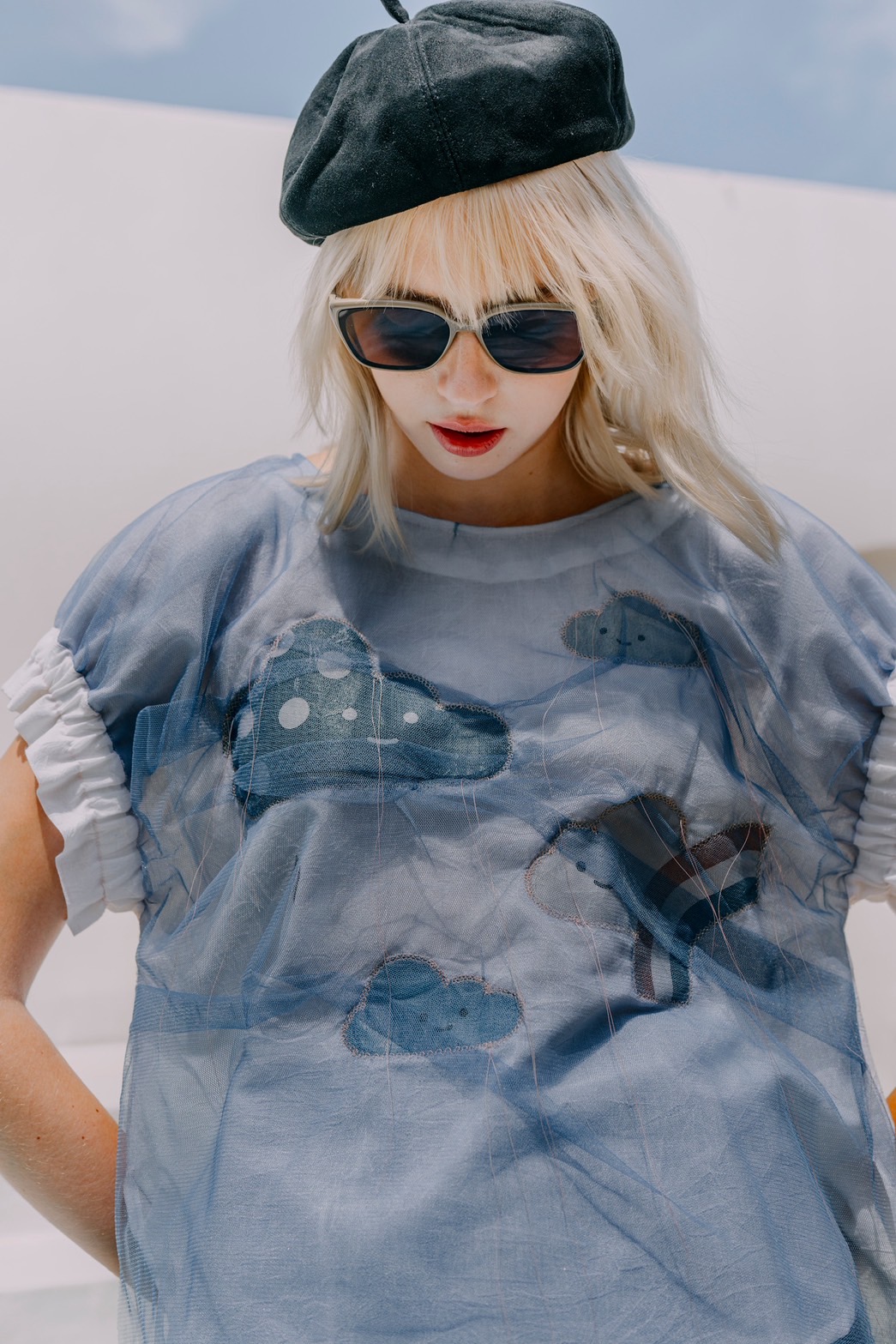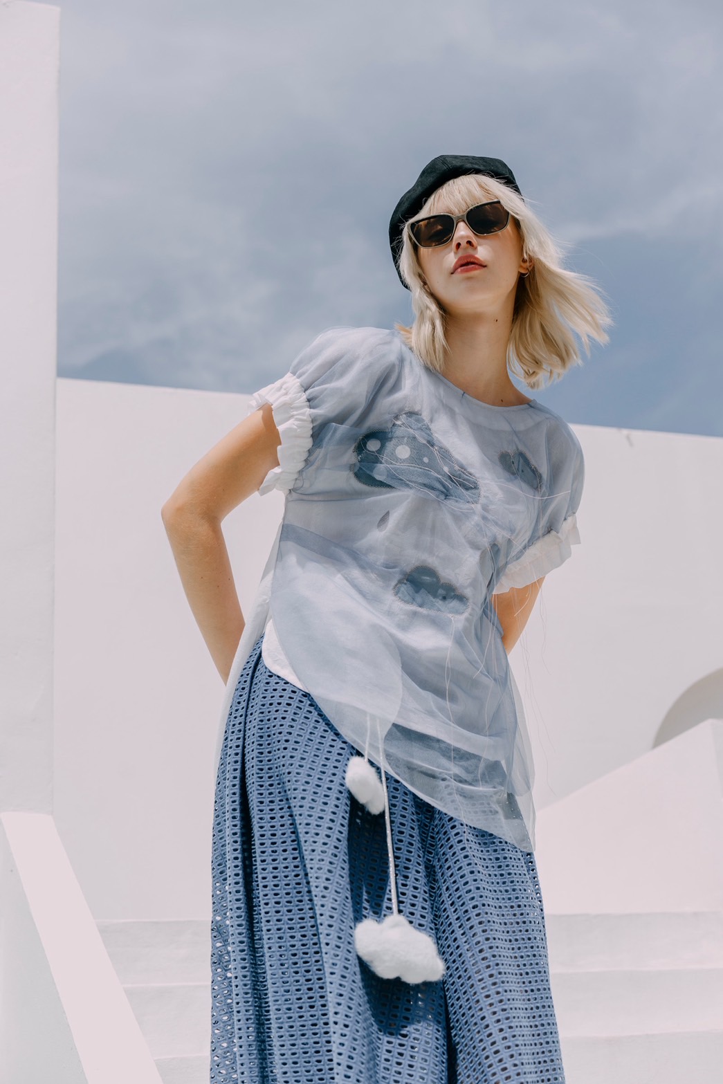 Rainlight cloud top in cotton with navy sheer overlay, featuring a digitally printed cloud motif.