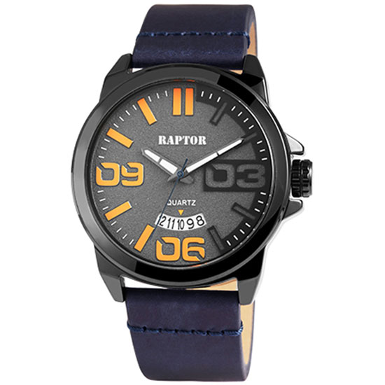 Displayed here is a classic analog watch with a round dial in orange and black. It has a leather strap and is equipped with a Miyota movement to provide accurate and reliable performance. This analog watch is easy to read and can complement your look well.